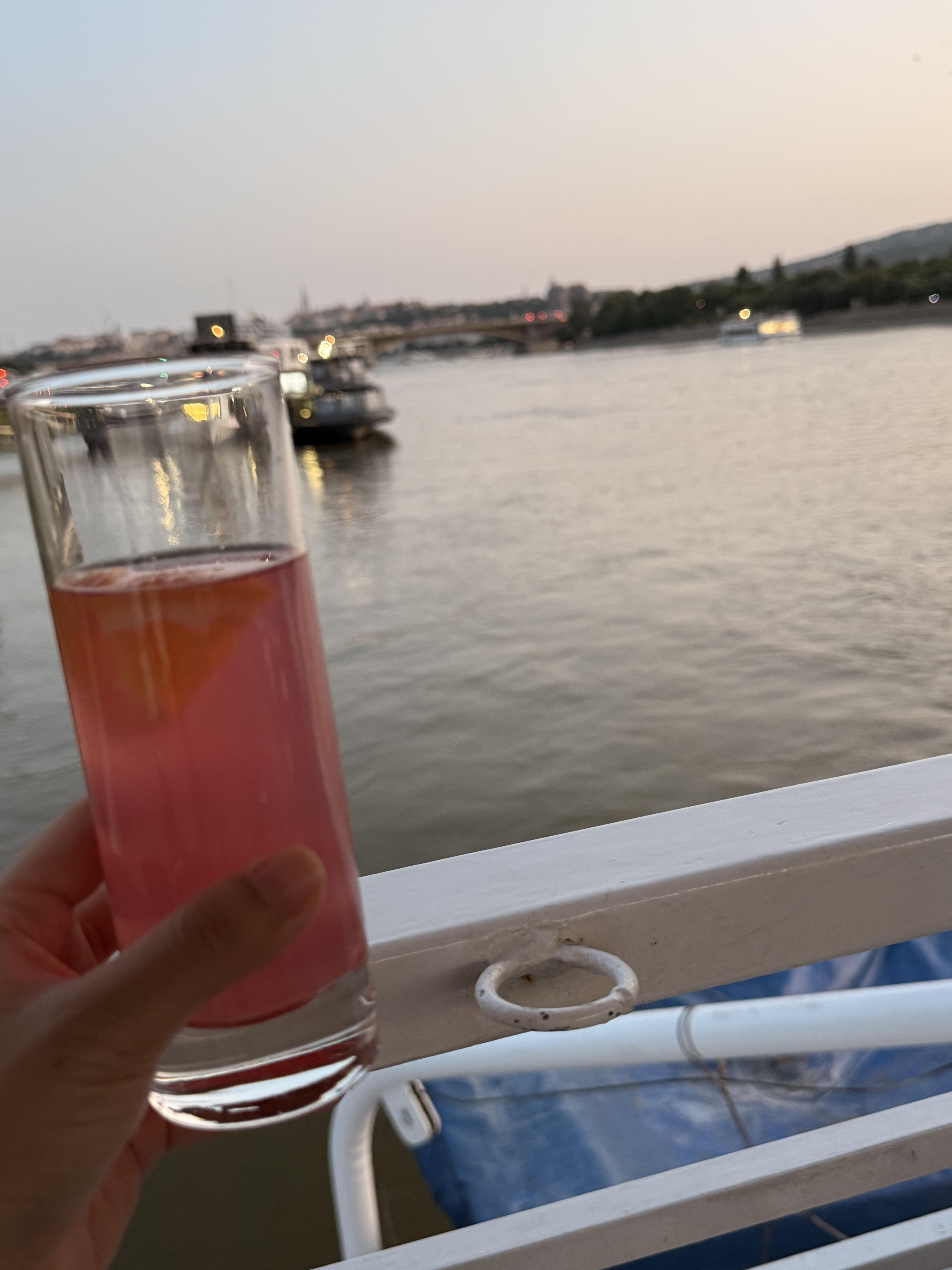 晚上的遊船我訂的是20:45的場次,當時還擔心有點太晚,結果夏天的歐洲到晚上八點半還沒全黑!哈哈哈哈可以玩到超晚(但會超累),我真的很慶幸我很早就到,雖然排隊等很久但回頭看那長長的人龍就覺得我真是太棒了(摸臉)!上船後會給一杯香檳或是雞尾酒,我聽說香檳很難喝所以要了雞尾酒。結果只能說⋯味道淡到~~~哈哈哈哈算了啦我是來看夜景的也不是來買醉的😆