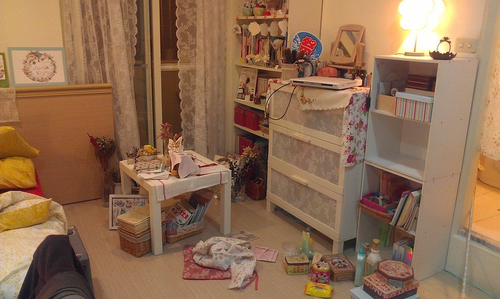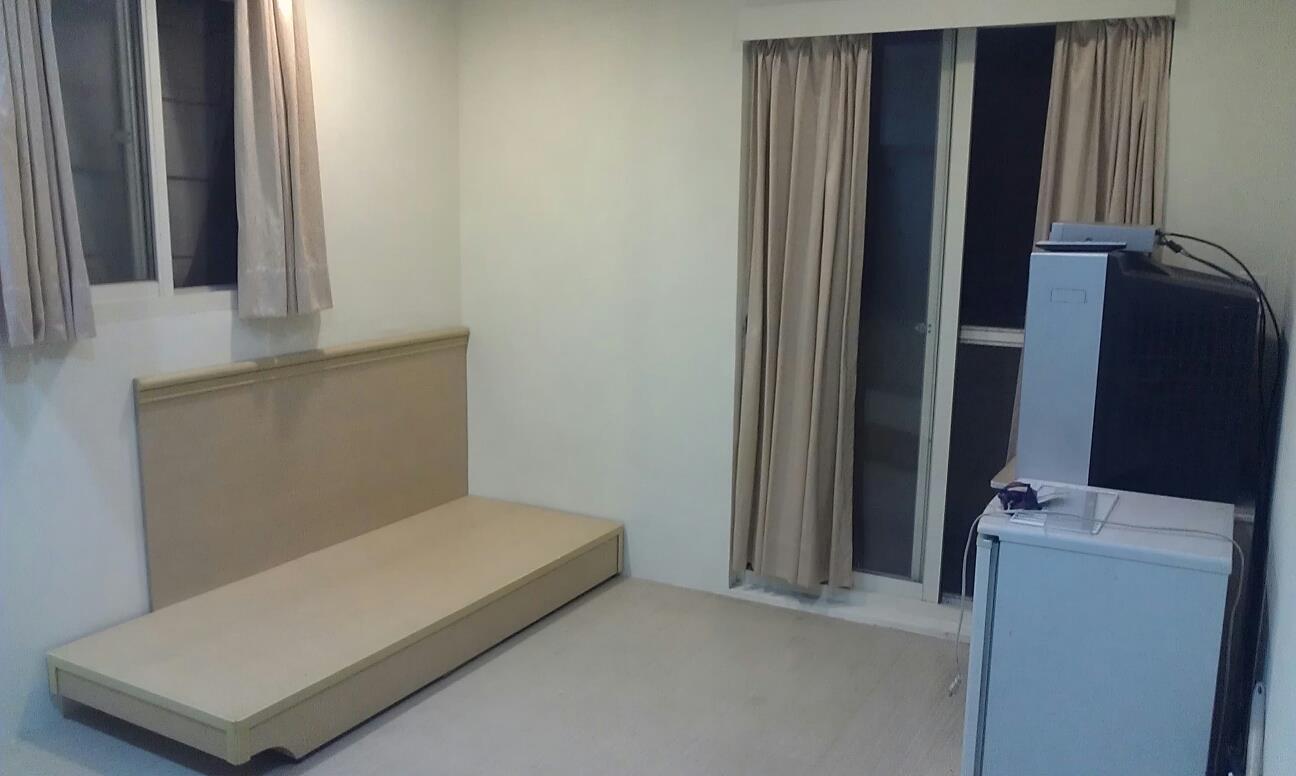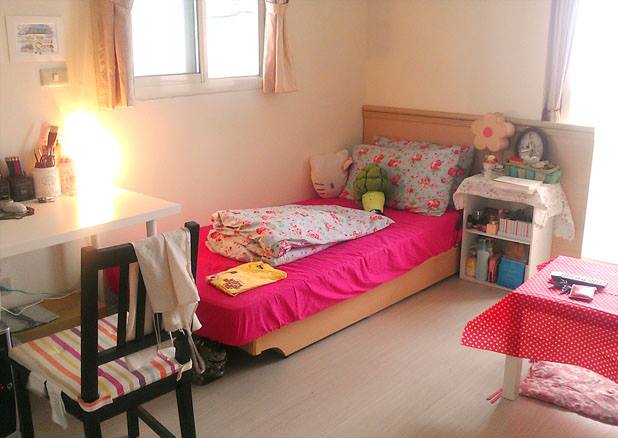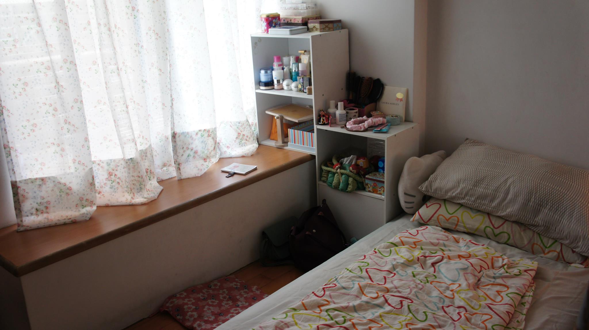 這是當時我的房間,小到不行,裝下一個單人床就已經差不多了。窗戶外是一個小陽台,室友要曬衣服還要進來我房間。窗戶外是防火小巷,一不小心還能跟隔壁鄰居握手之類的(笑)因為自己房間實在裝不下我所有的物品,所以當時候我的櫃子、書桌都在外面,還好室友不介意。