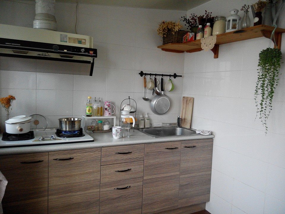 入住前:廚具、冰箱、鞋櫃、電視、書桌椅等都是房東附的。我記得當時還有一個單人座的小沙發,可是我嫌空間不小不想使用所以請房東搬走了。整體非常乾淨明亮,陽台還有外推可以洗衣曬衣,當下就決定租下這裡,誰要住有老鼠跟小偷的房子啦~