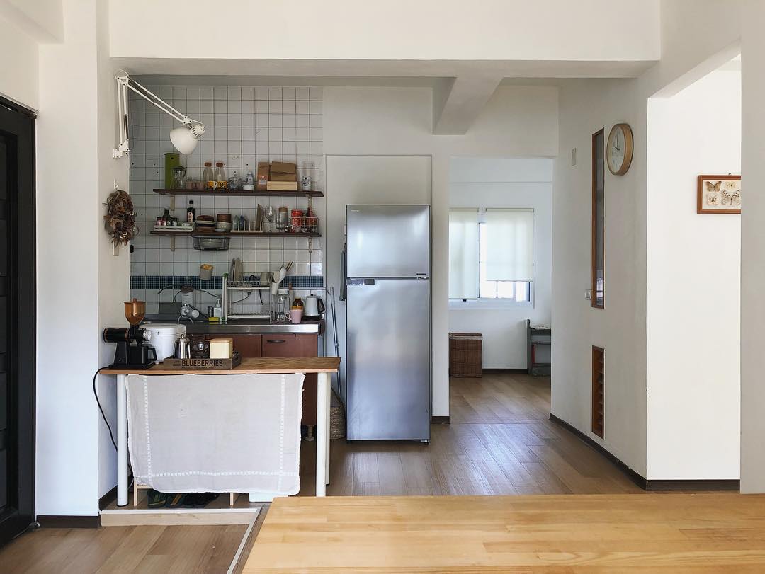 剛開始住進來的時候可以說是「家徒四壁」,因為大叔秉持著「能省就省」、「能不買就不買」的心情在住這裡,照片中的桌子、櫃子都是房東留下來的,我們只多買了椅子跟電風扇,連吸塵器都是從我工作室拿過來的(笑)