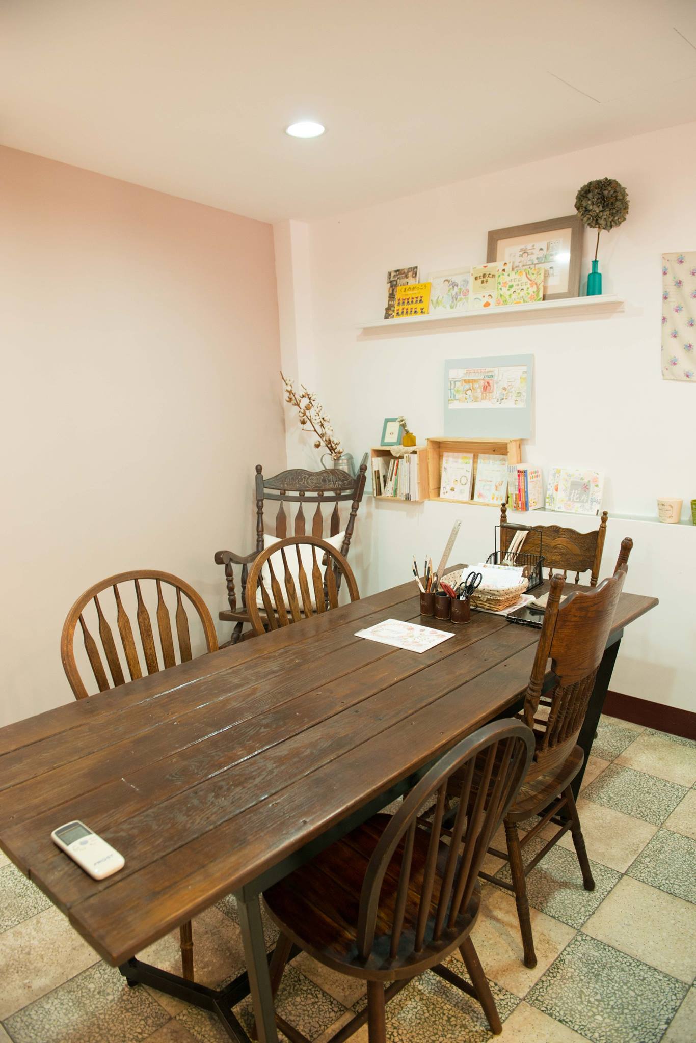 而我們主要上課的長桌,也是大翰哥整理民宿時,拆下來的圍籬的木板釘成的,搭配上溫莎椅,這裡就是我們一起畫畫、做手作、刺繡的空間。從2016年到現在,開過上百堂的水彩插畫課、花藝課、手作課等等。不可思議的,我將我理想的畫面漸漸成真了,每次走進工作室,換上圍裙,就覺得自己的夢想實現了。