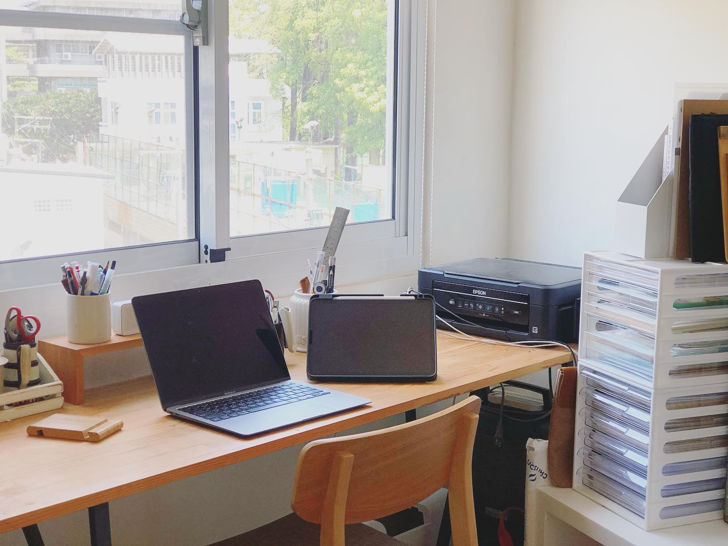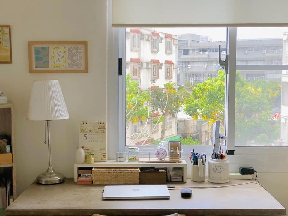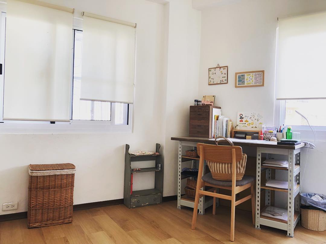 我家臥室旁的另一個小空間,目前是我跟大叔的工作室。(雖說是「我們的」,但其實大部分都被我佔據啦科科)現在是我跟大叔一人一張桌子,我會在這裡工作、畫畫、上課;我有一個奇怪的癖好,是覺得書桌一定要在窗戶前(這是我看《慾望城市》學凱莉的)。剛好這裡窗外就有好幾棵阿勃勒樹,當初夏時節阿勃勒開花的時候,窗外就是滿滿的黃花,真的好漂亮!