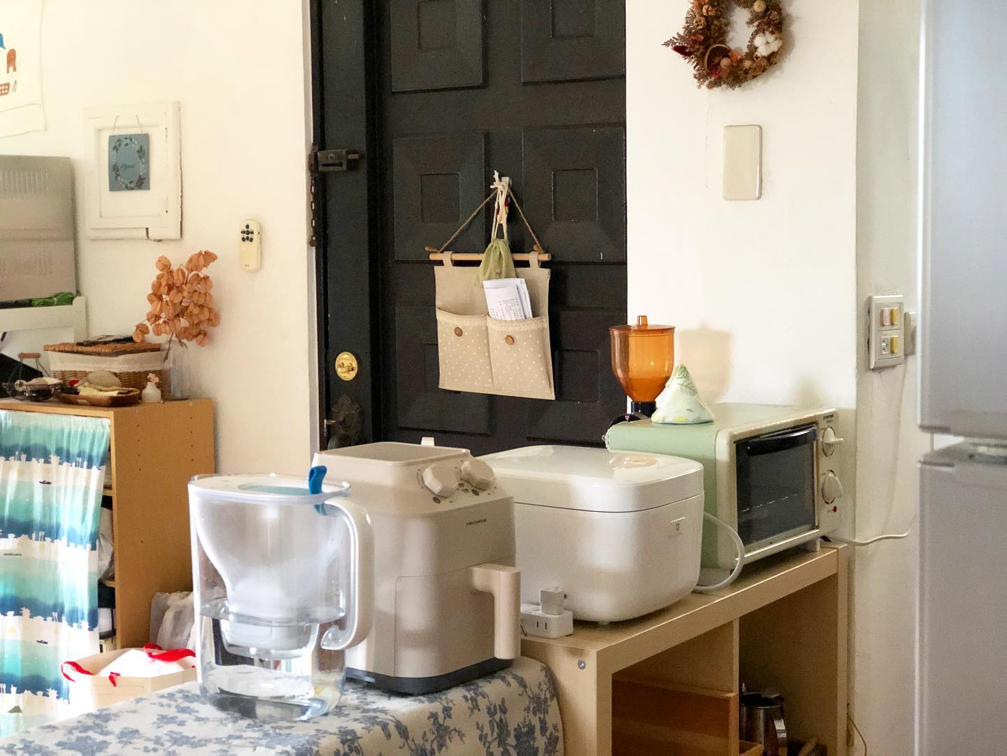 因為廚房的收納空間不多,所以我們用了兩個小櫃子來當電器櫃,也當廚房跟餐廳的小小分隔;這兩個櫃子是不同的,一個是IKEA的四格收納櫃、一個是宜得利雙層櫃,都是我以前就買的。上方放置了常用的小家電,分別有咖啡機、小烤箱、電子鍋、氣炸鍋與Brita濾水壺。(關於家電的購買又是我跟大叔的另一段拉扯,又可以另外寫一篇長篇大論來跟大家分享了哈哈,等我!!)