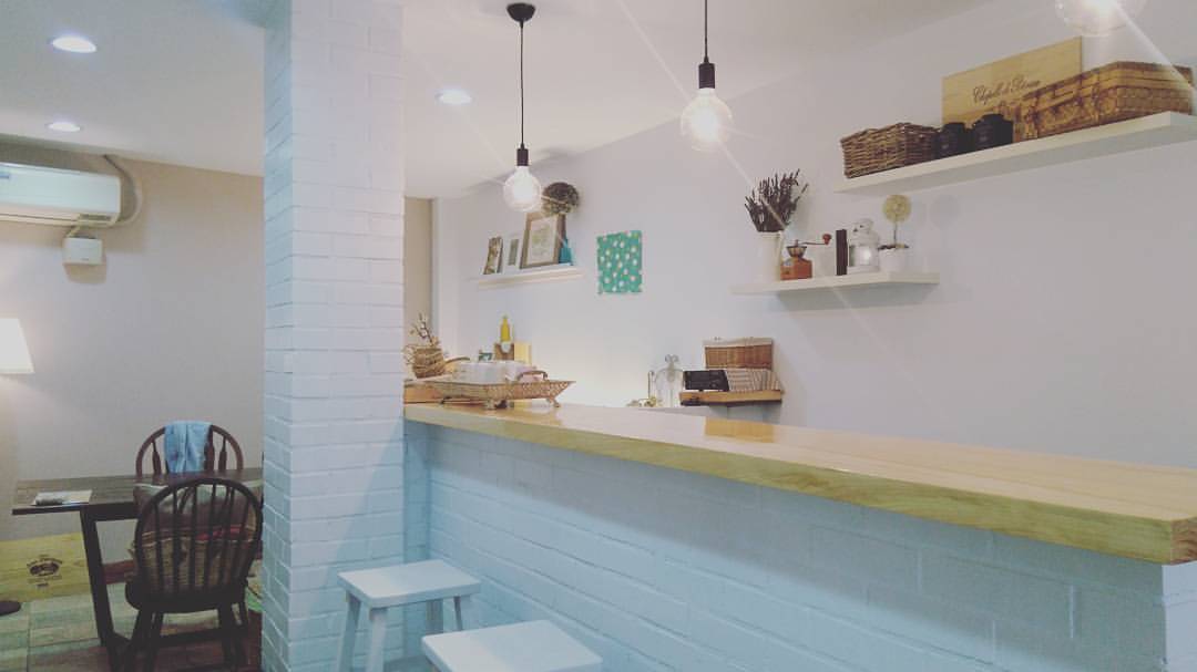 把紅磚漆白、吧台桌的木頭更換、吧台椅漆白、牆壁漆上主題色的淡紫後,我的工作室雛形就慢慢成形了。