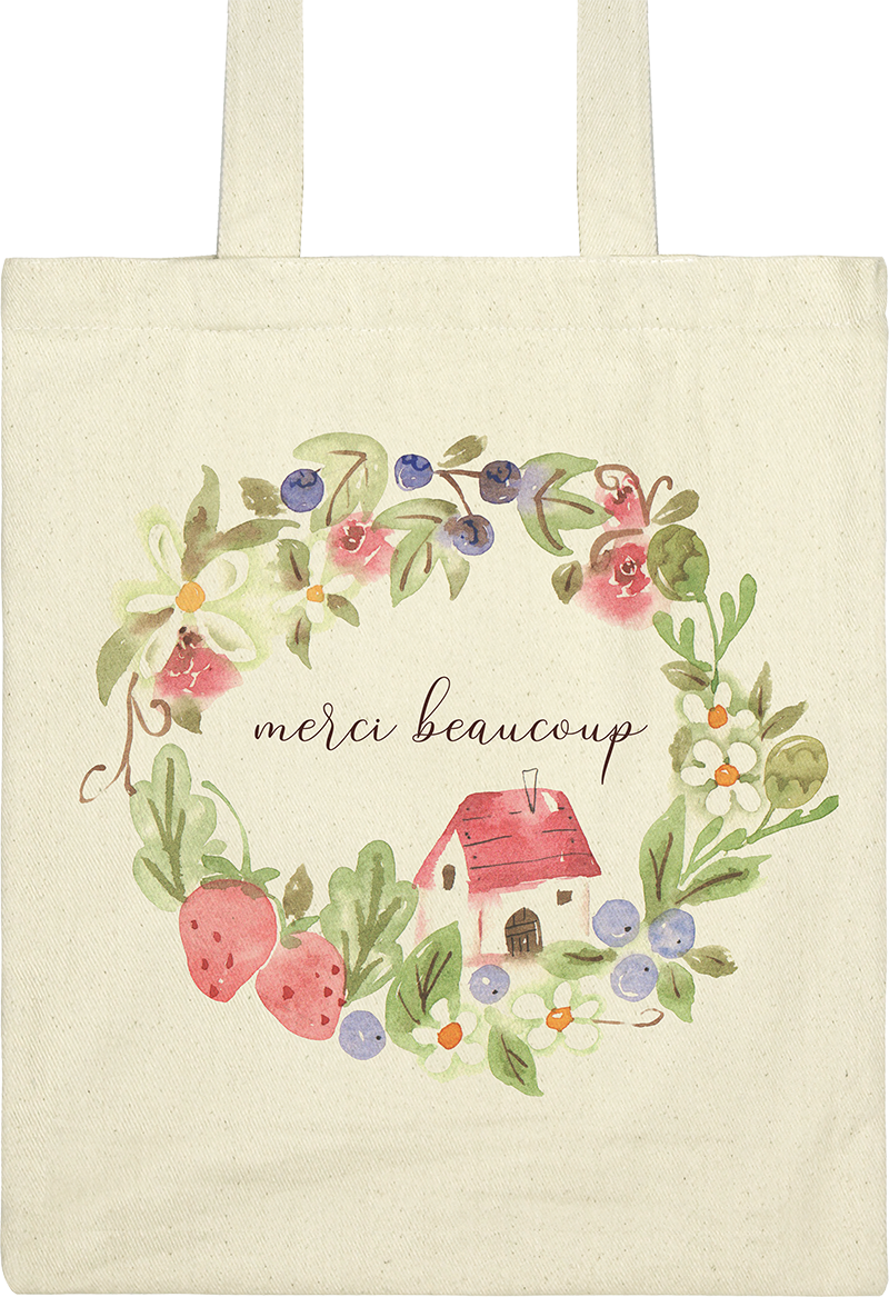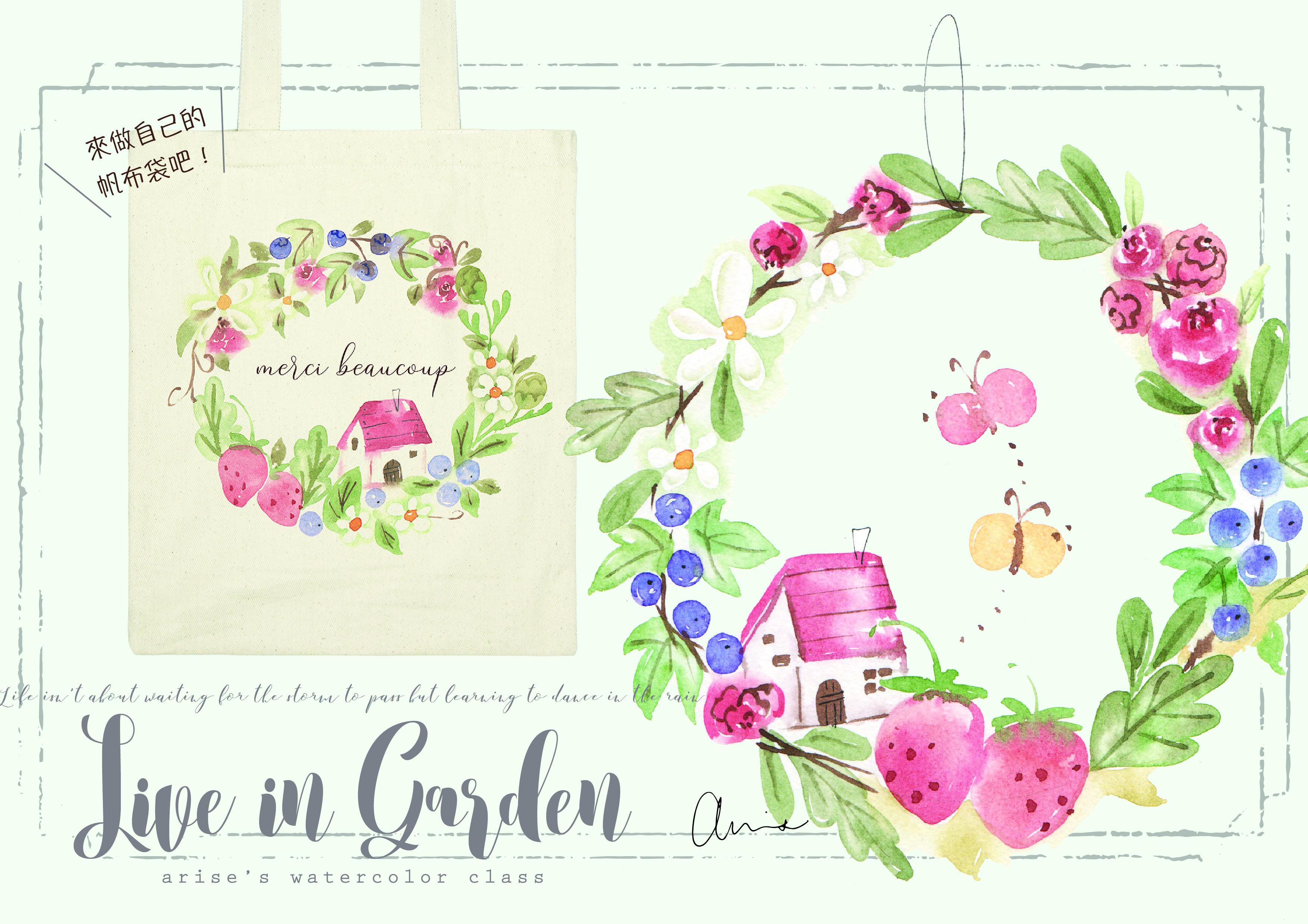 在好熱好熱的夏天裡,用水彩清涼的顏色,圈成喜歡的花圈。印在方便攜帶、揹著的帆布袋,陪你一起上課、旅行