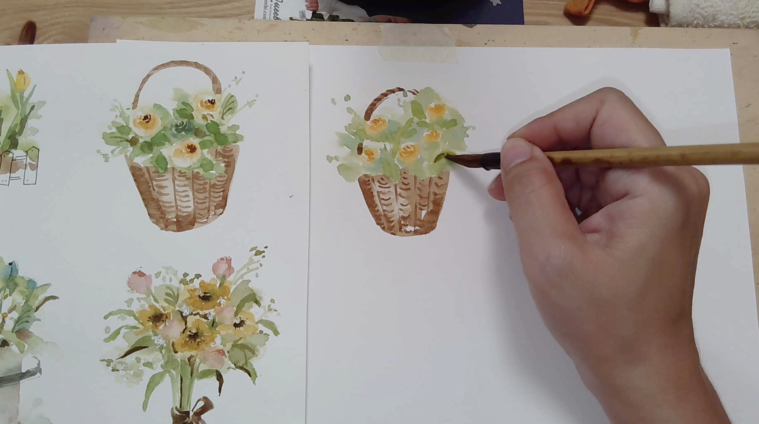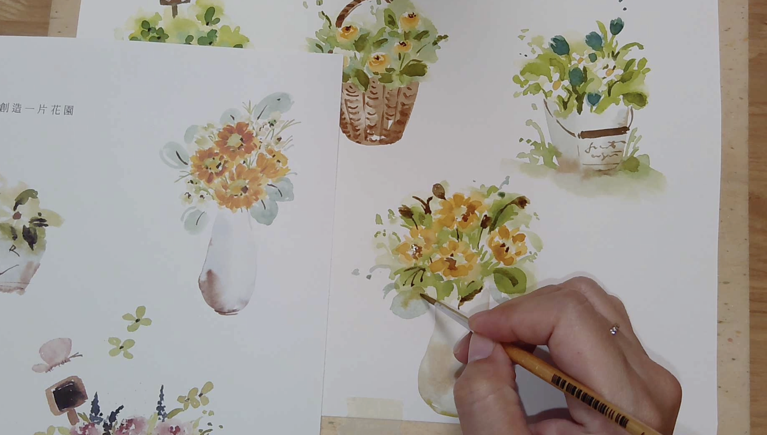 ![]() 練習了小品盆花後,來挑戰看看綜合花束吧!利用簡單的草稿定位花朵的位置,再依序渲染不同層次的綠葉顏色,一邊觀察水分的流動,一邊繪製花與葉。這將是一個較有難度的綜合練習,但畫完會很有成就感!請務必要試試看! |