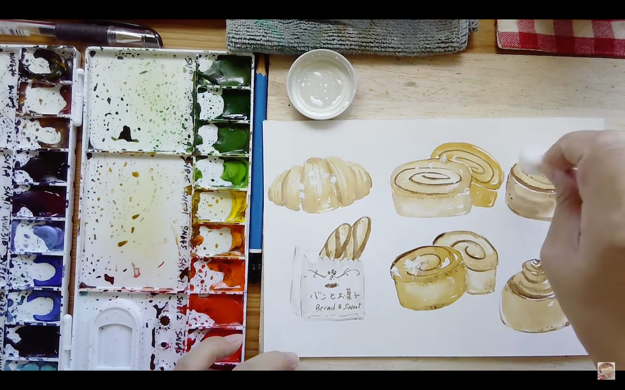 從貝果、可頌、菠蘿麵包到長棍、肉桂捲...一個一個示範好吃的麵包,我們不打草稿,而是直接用毛筆(水彩筆)來繪製,透過暈染、洗白等技法,來表現麵包的可口滋味! | |