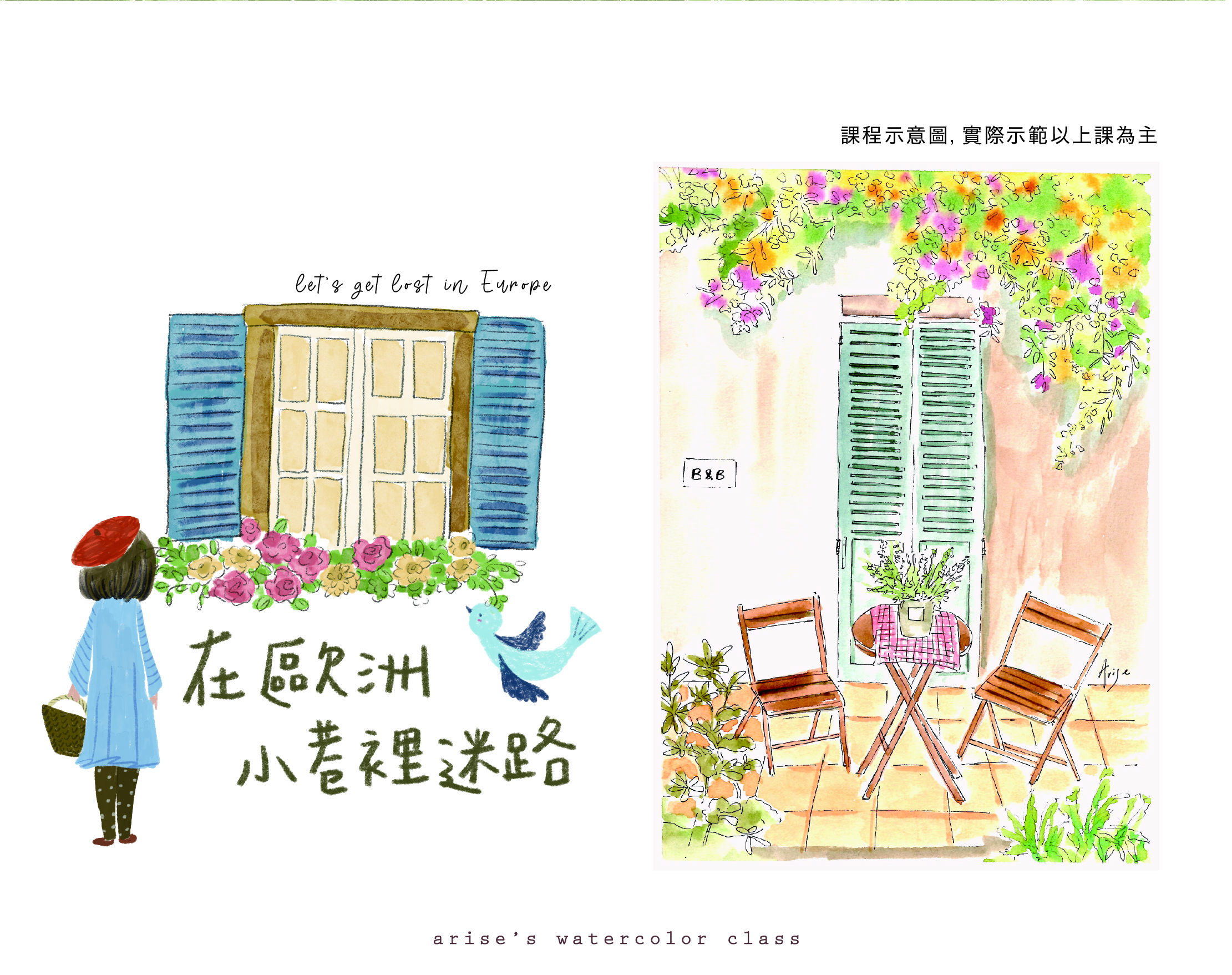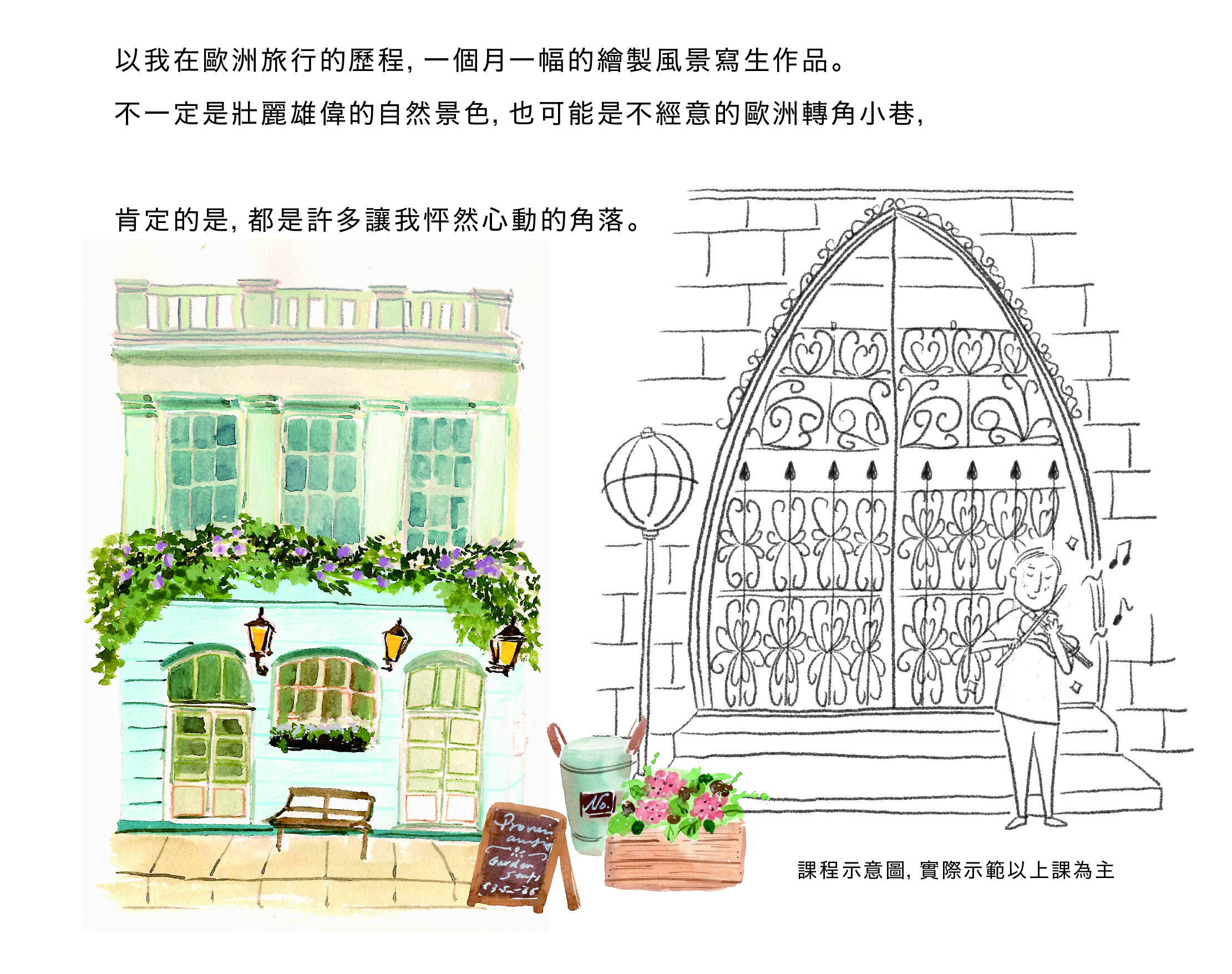 上課費用:12堂歐洲巷弄與風景繪畫課+個人插畫商品後製服務:21,000元