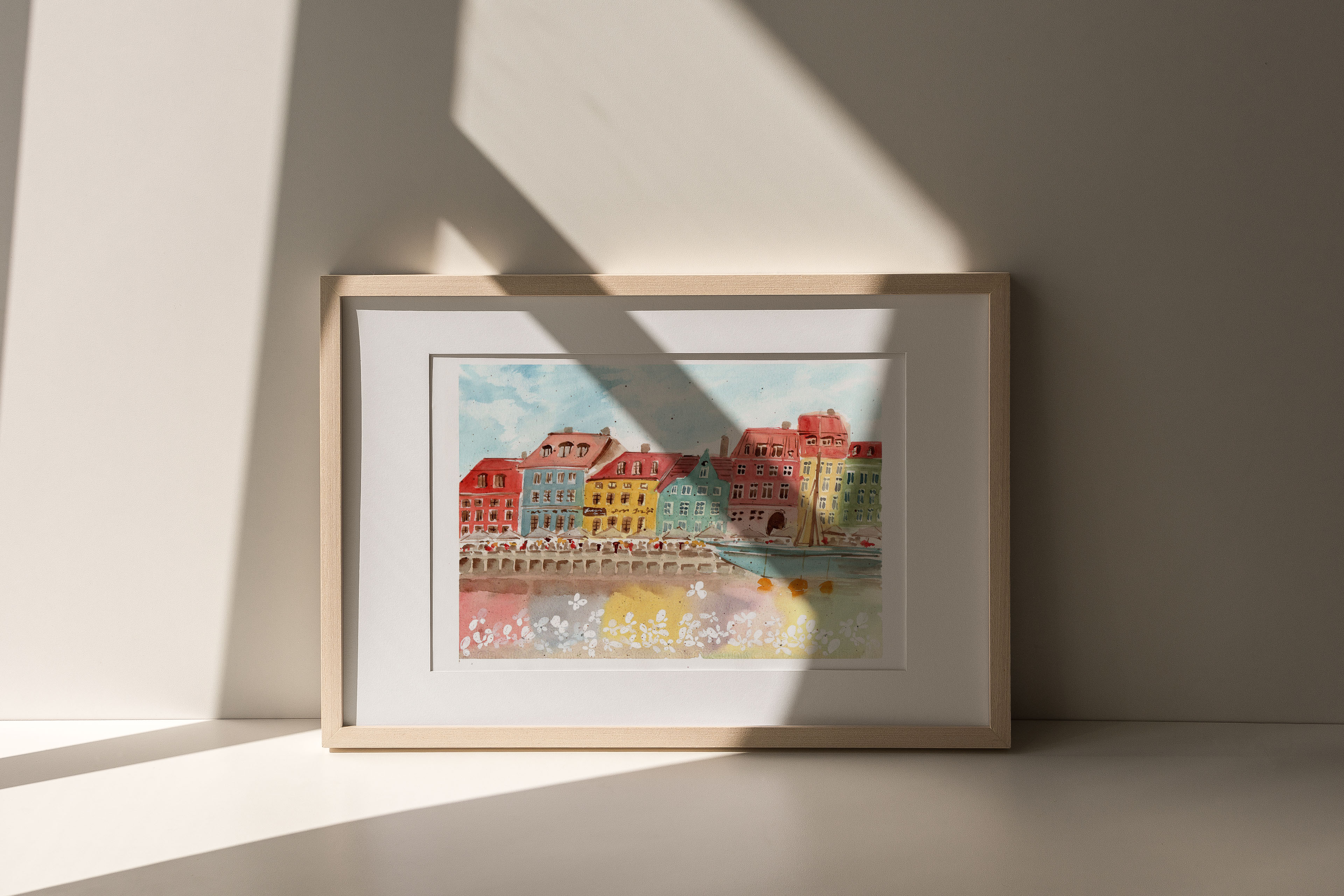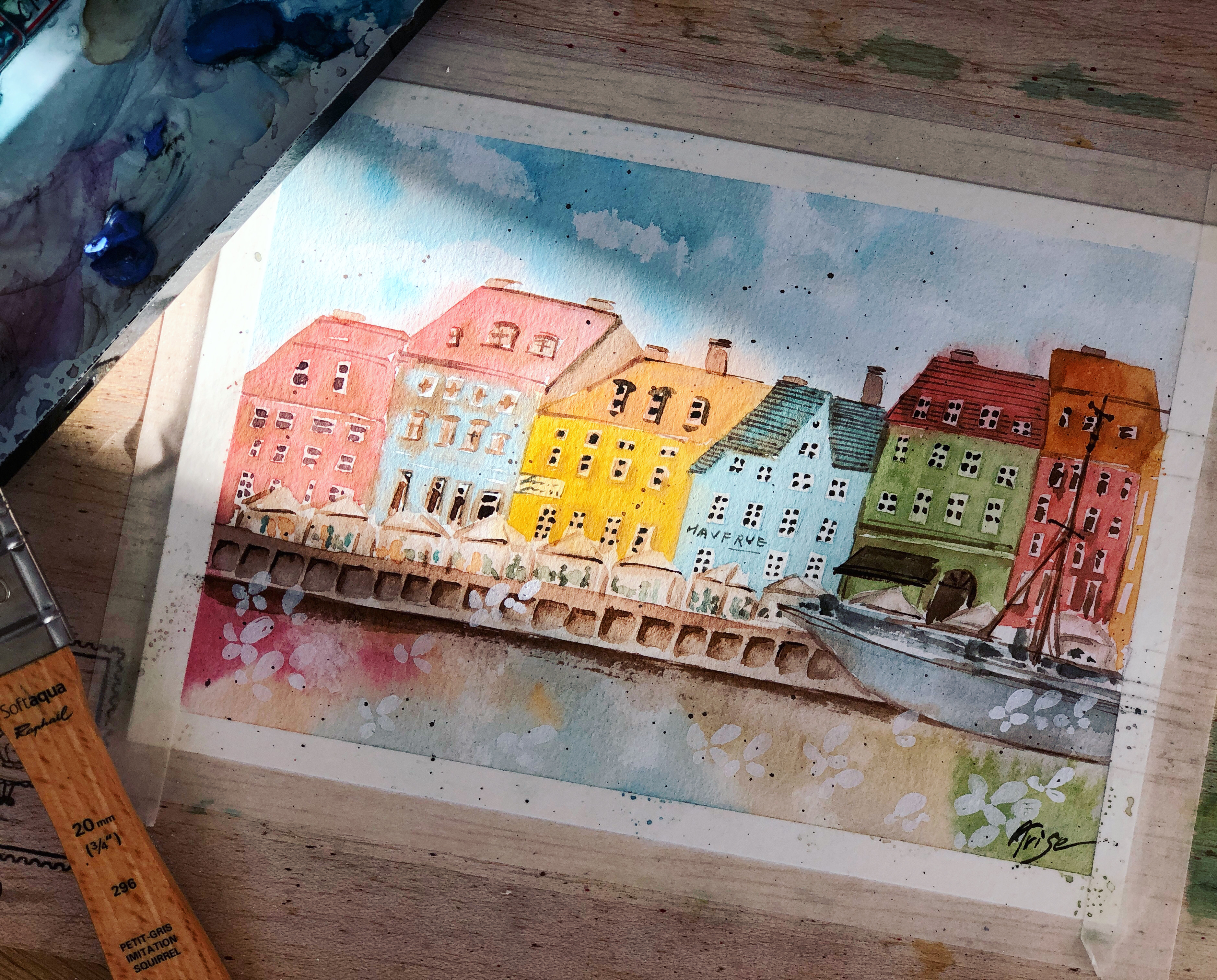 從亮麗的粉色、綠色、黃色建築,到柔和的水面反射,每一筆都能讓您感受到丹麥新港的獨特魅力。