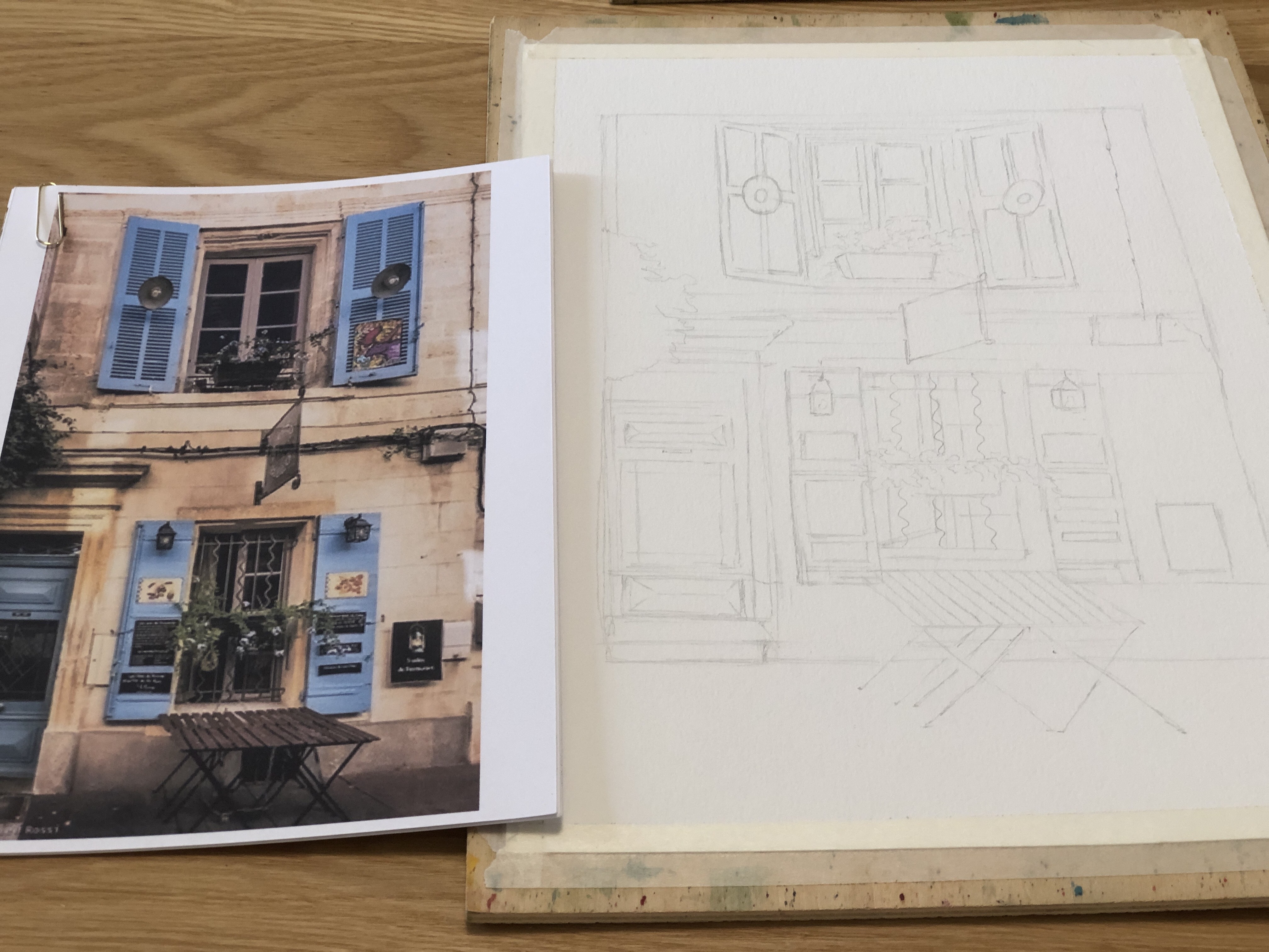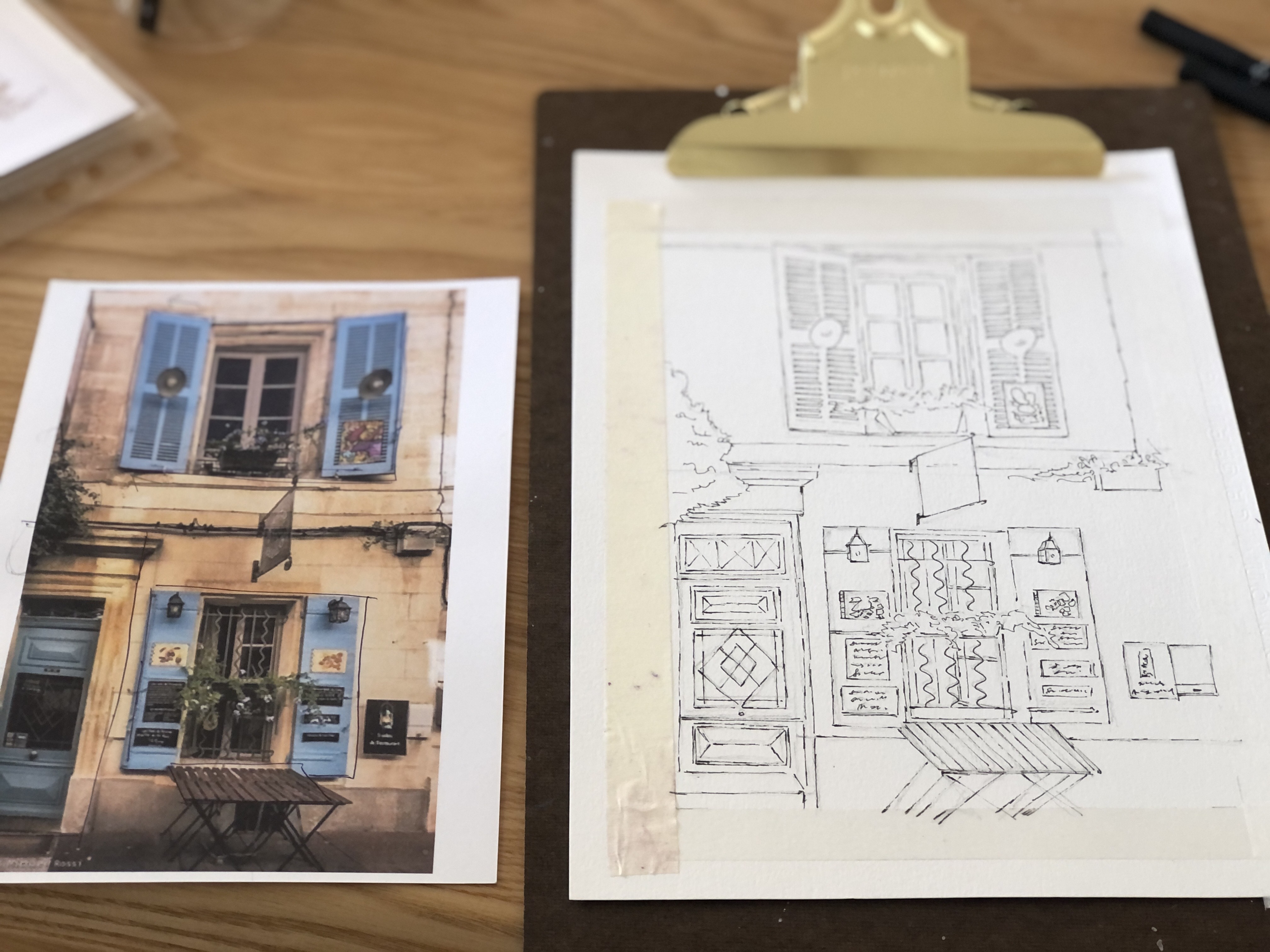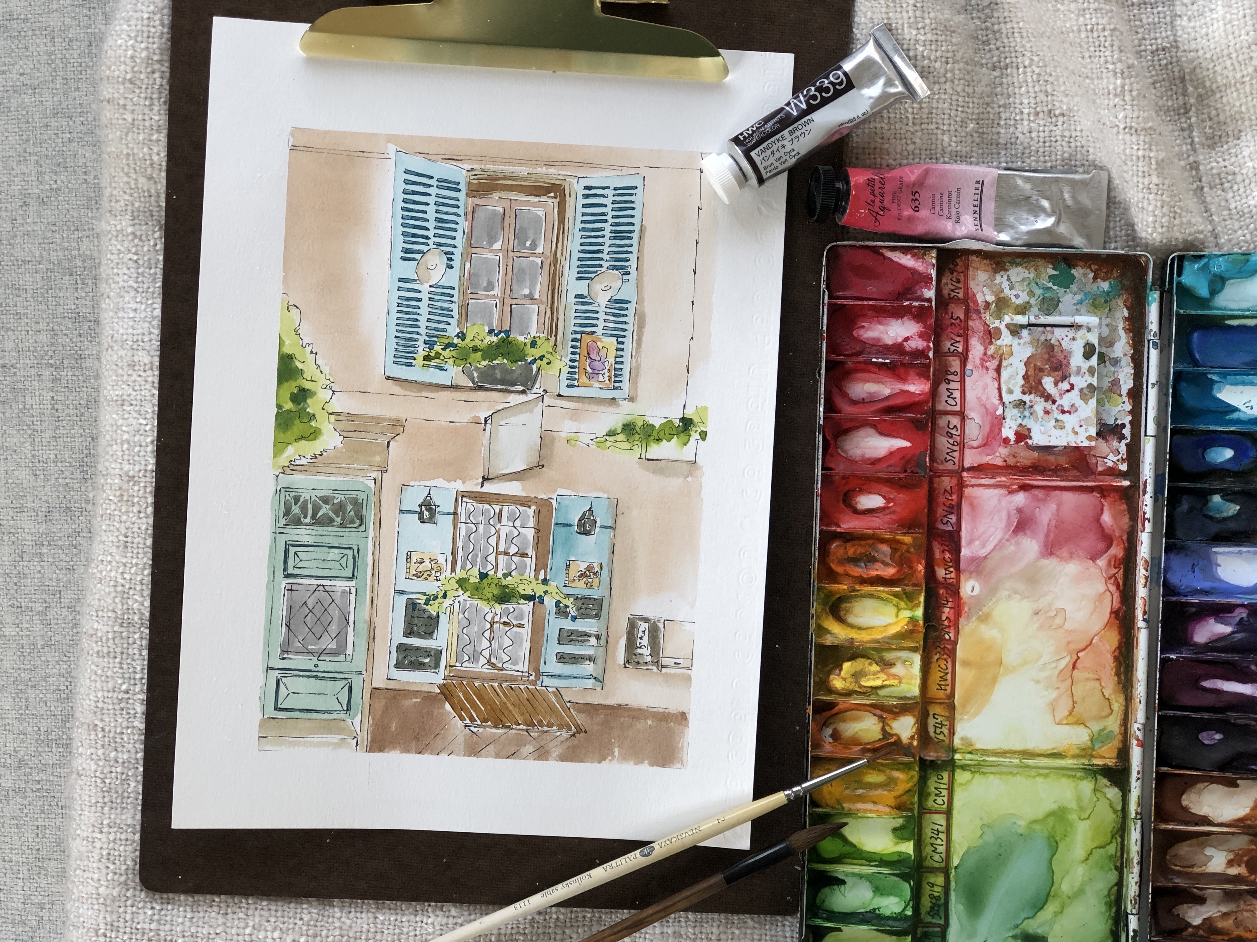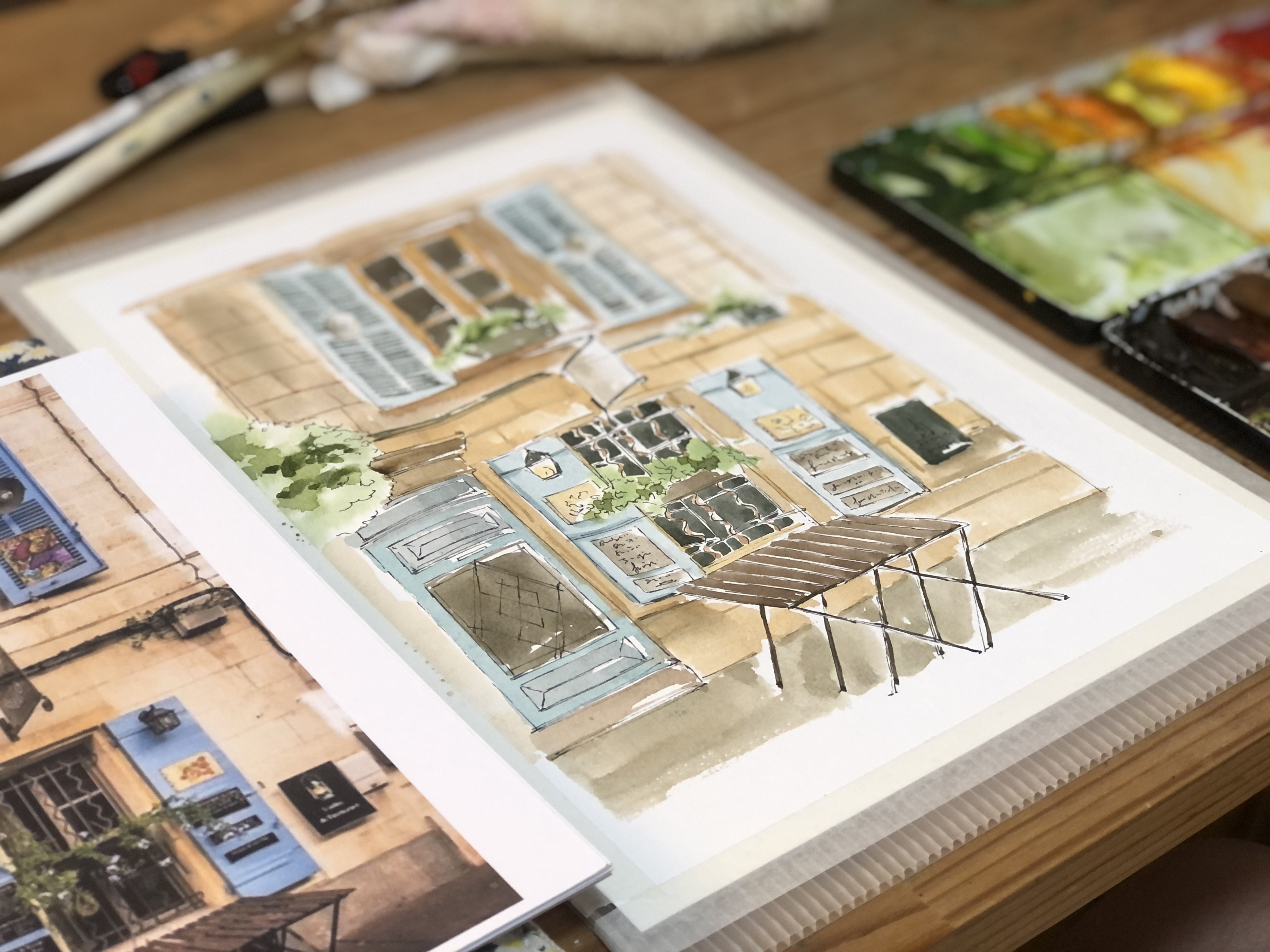 最後以透明水彩來上色,為你的歐洲街景穿上美麗的顏色。