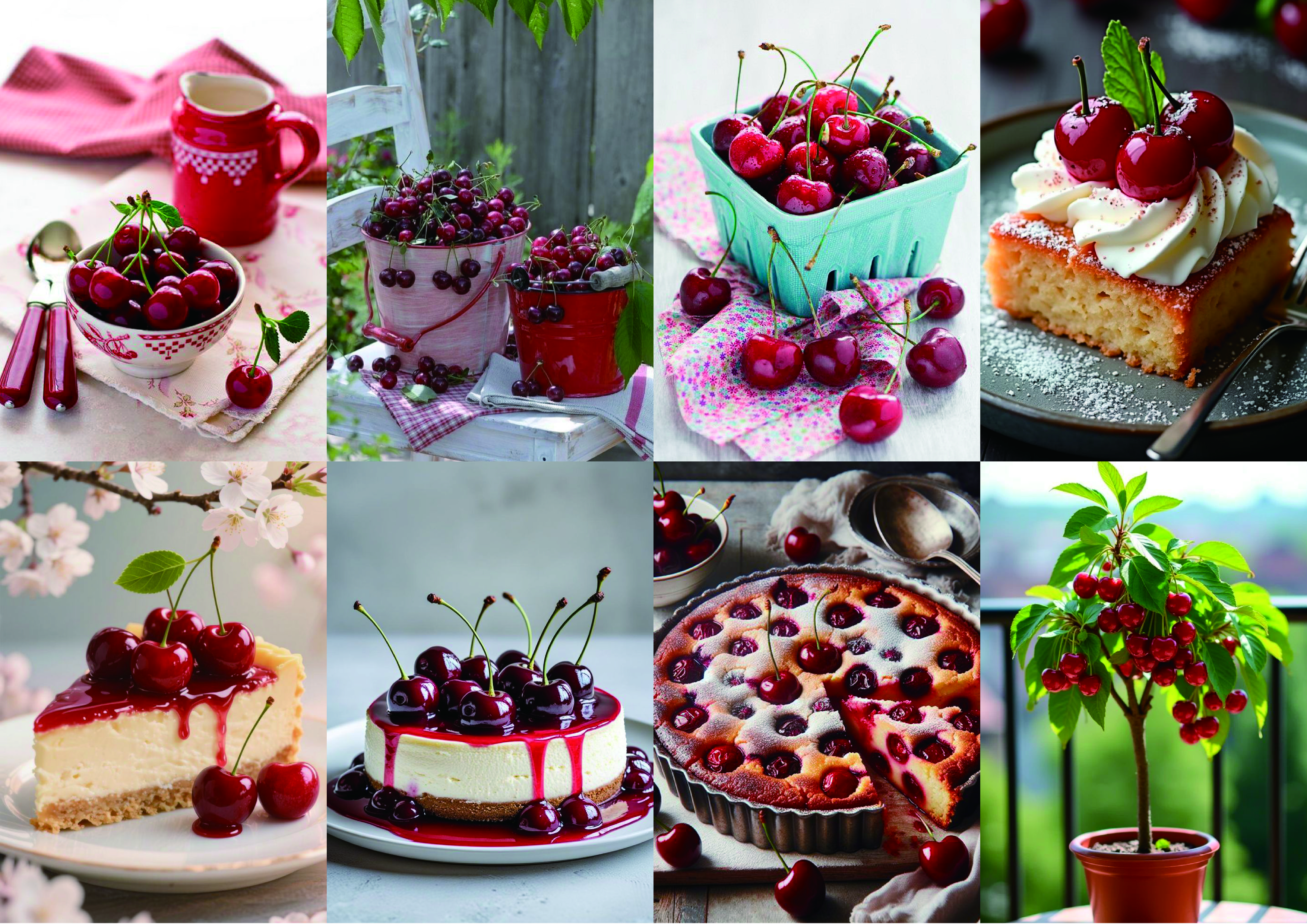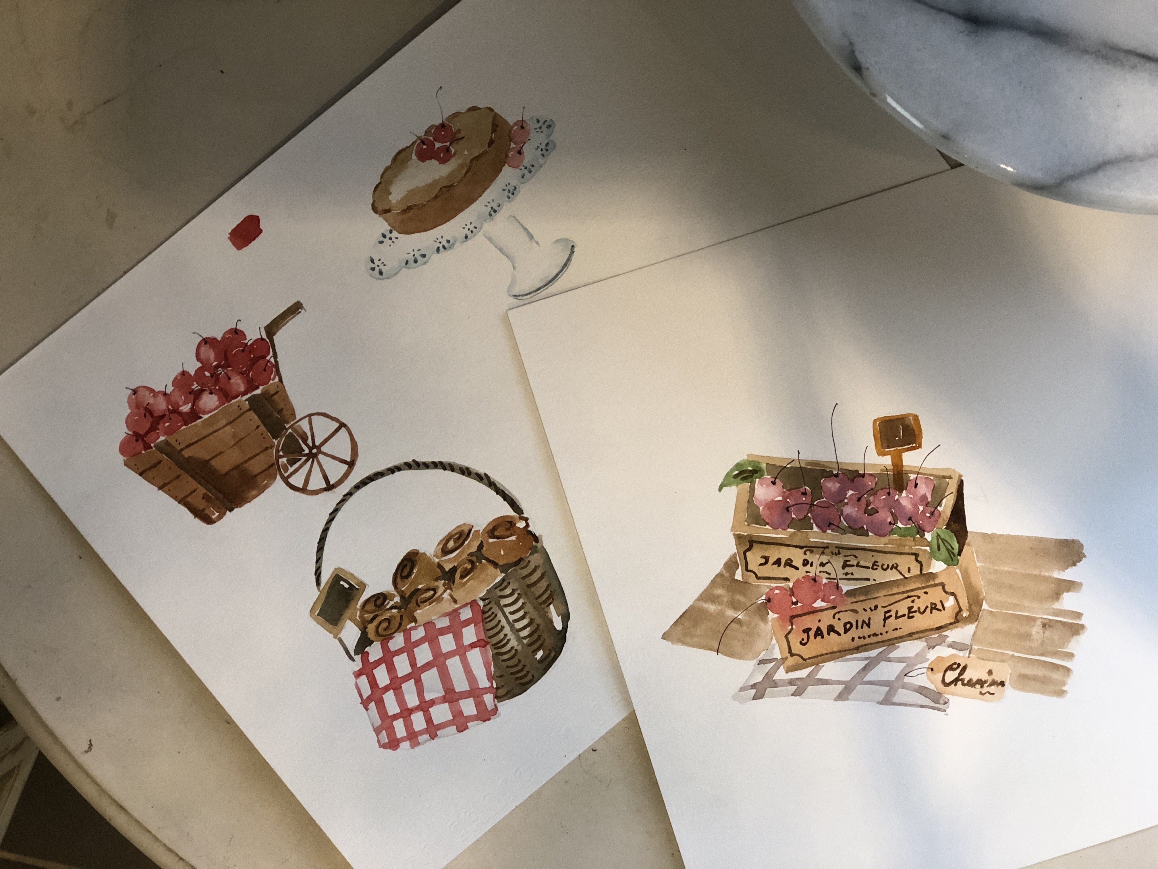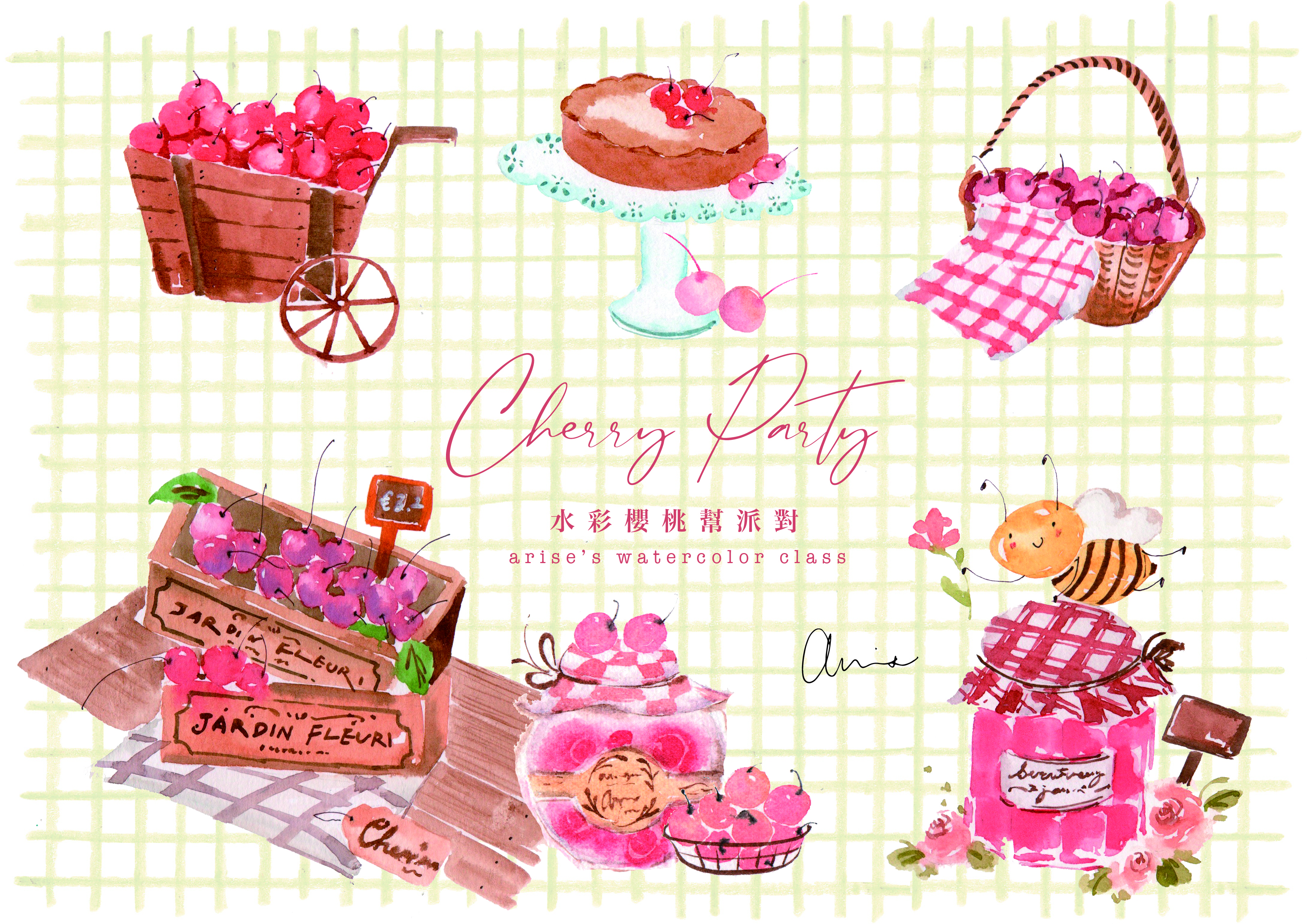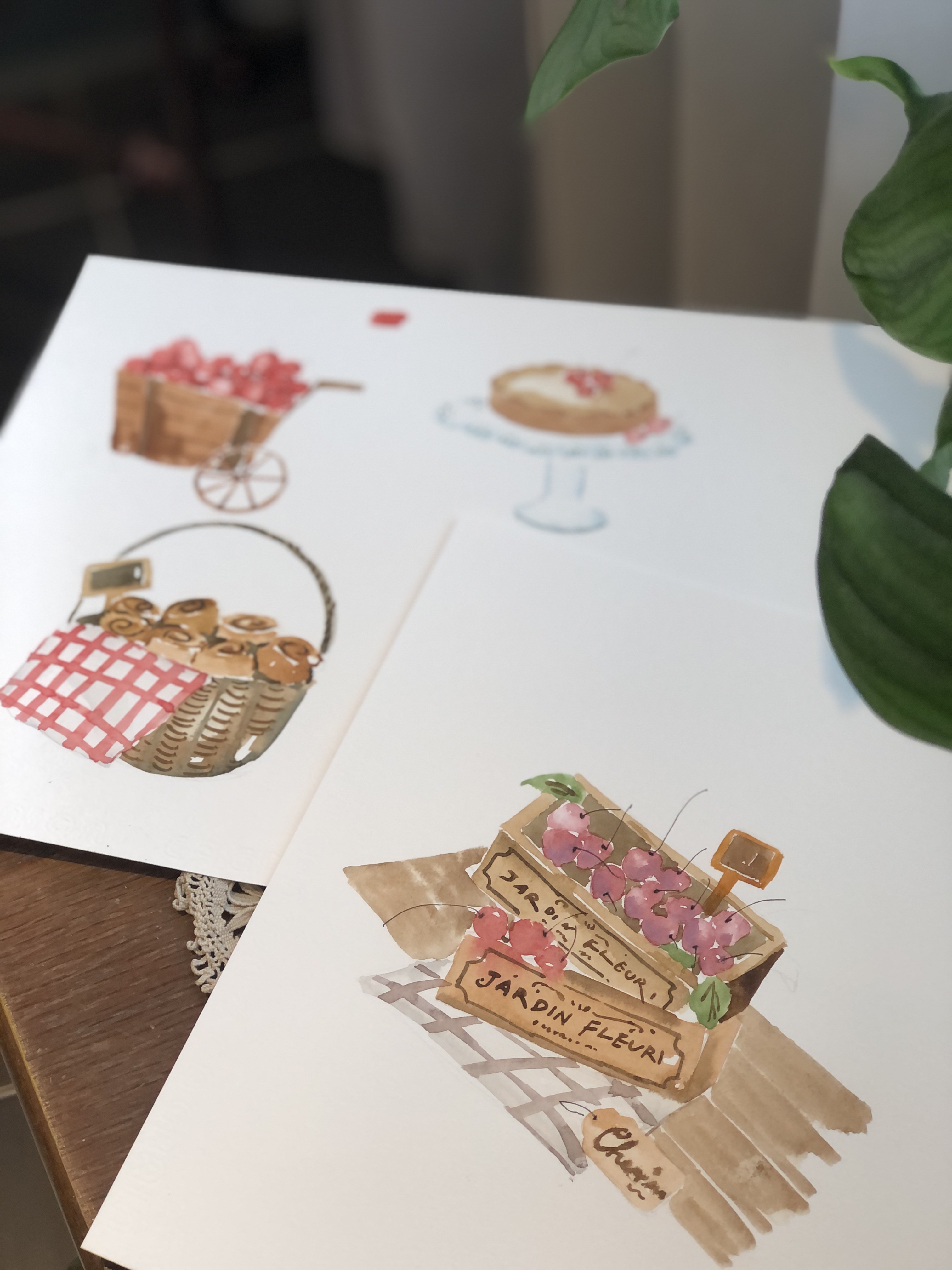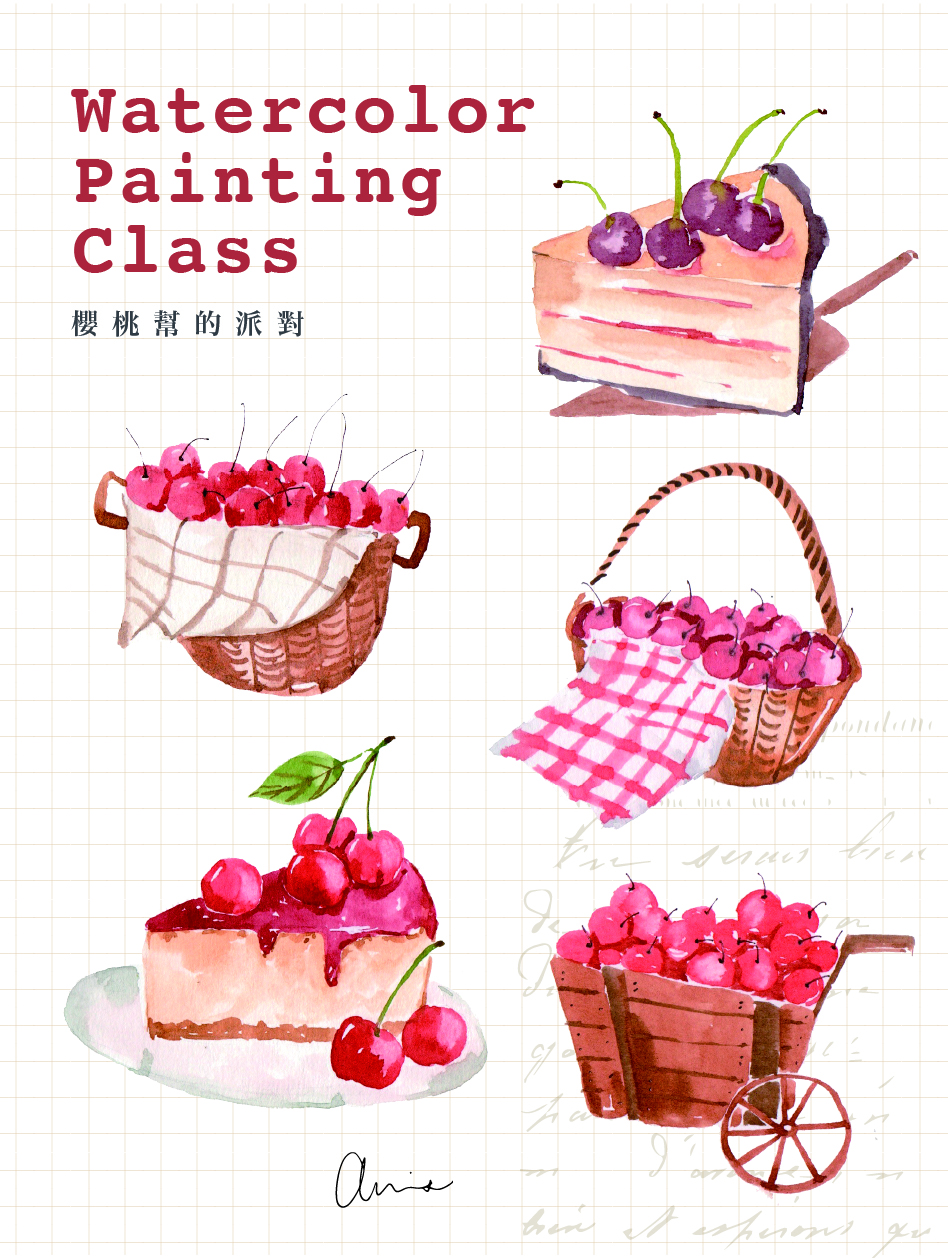 一籃籃飽滿的紅色果實、鋪著格紋布的小提籃、剛出爐的櫻桃蛋糕,還有甜甜的果醬與點心——這些日常裡的小美好,被輕輕收進畫紙之中,成為一幅幅溫柔又療癒的風景。