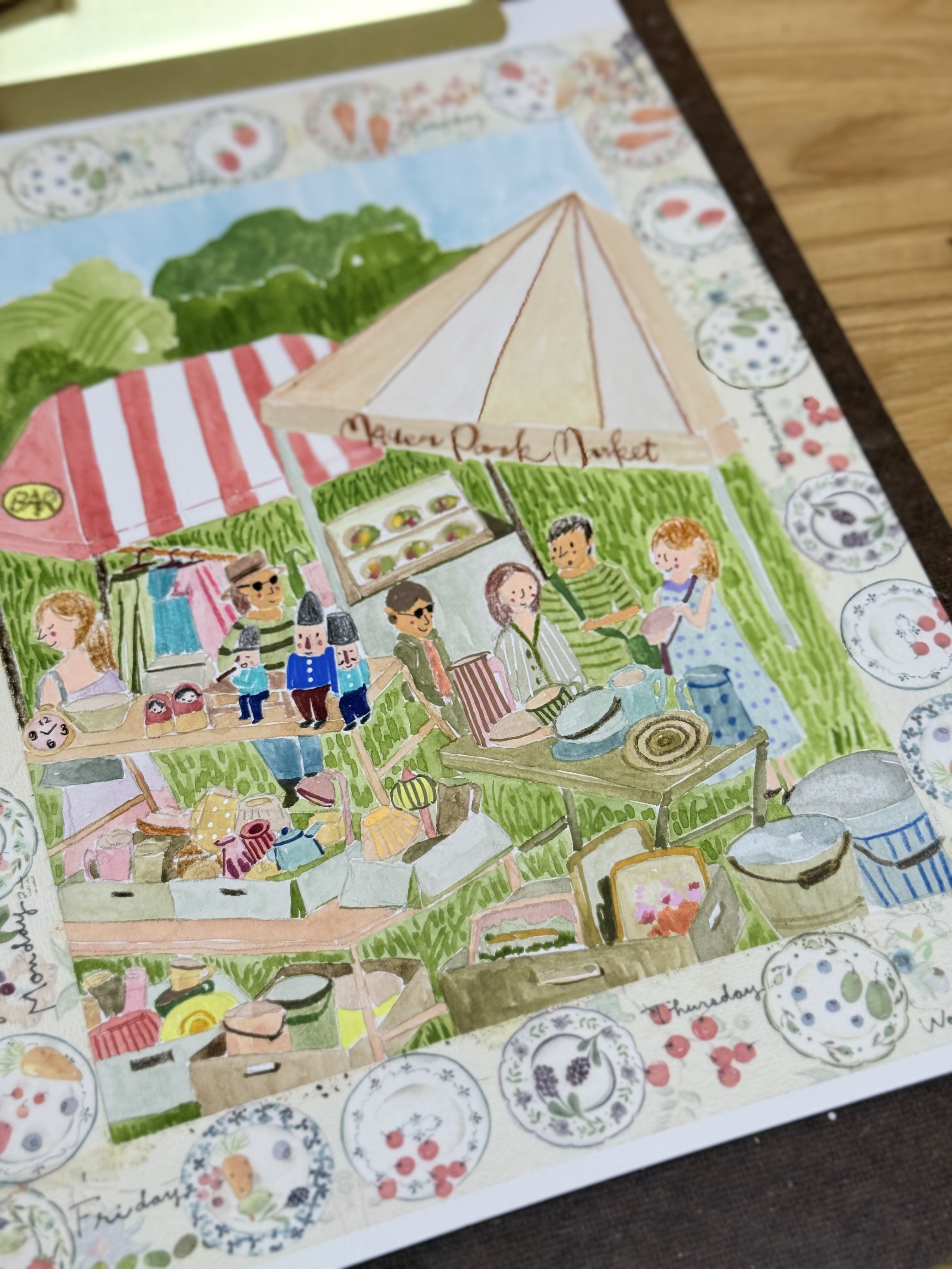 無論是熱鬧的攤位、繽紛的商品,還是充滿溫度的二手物件,都能透過水彩的溫潤色調,呈現市集的復古與浪漫。