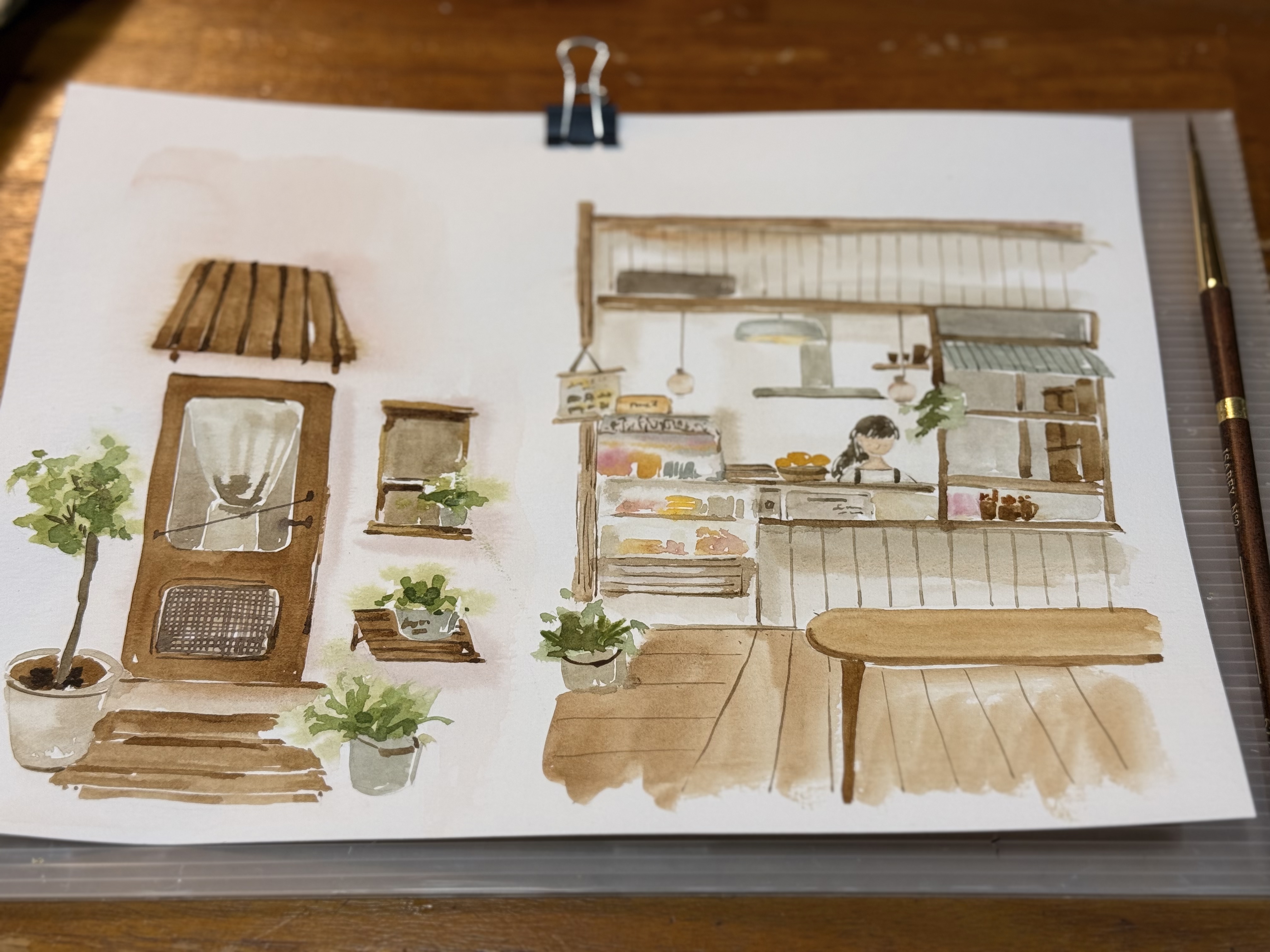 ✔水彩技法應用:濕中濕柔和背景、乾筆加強木紋與細節