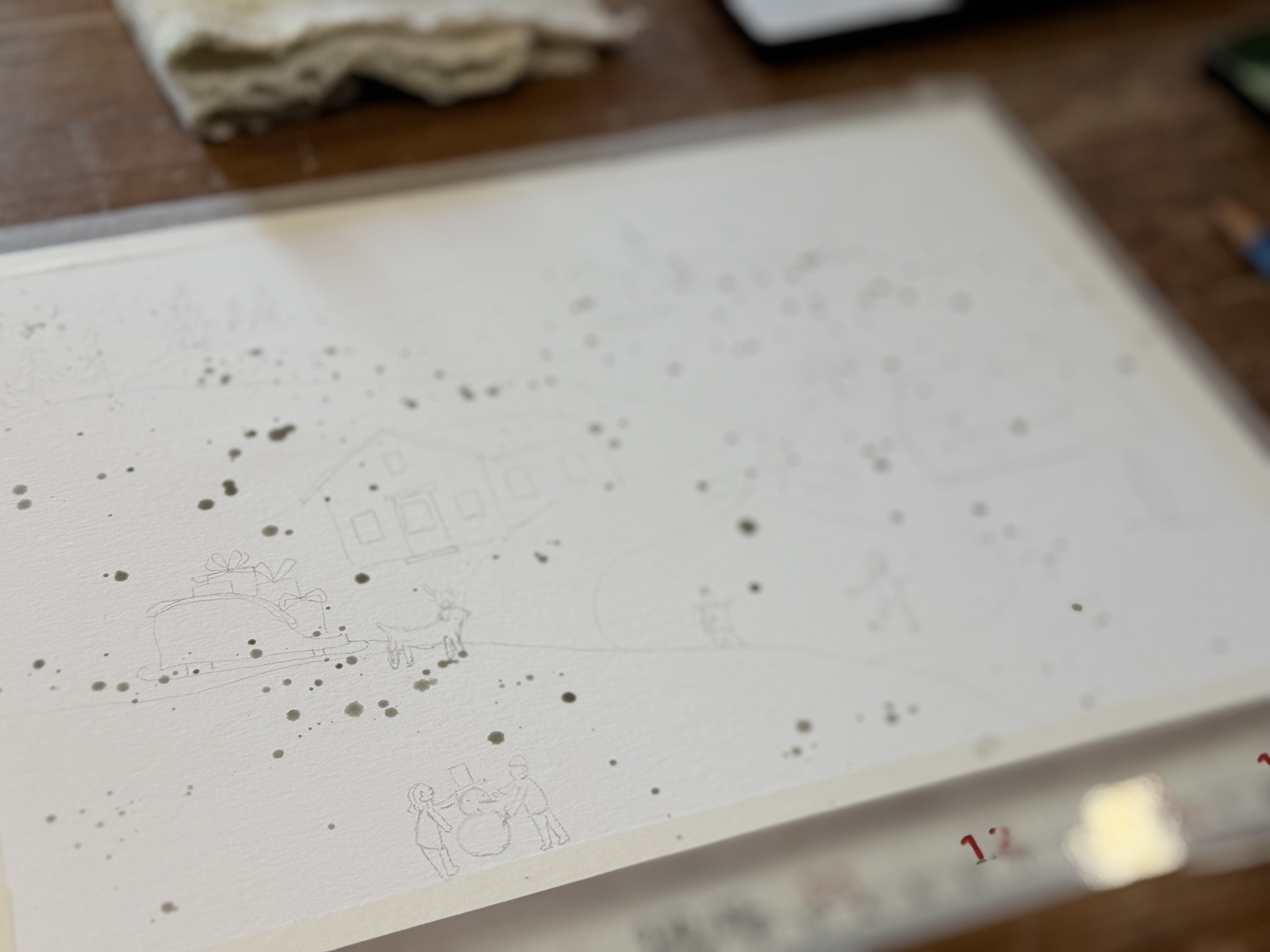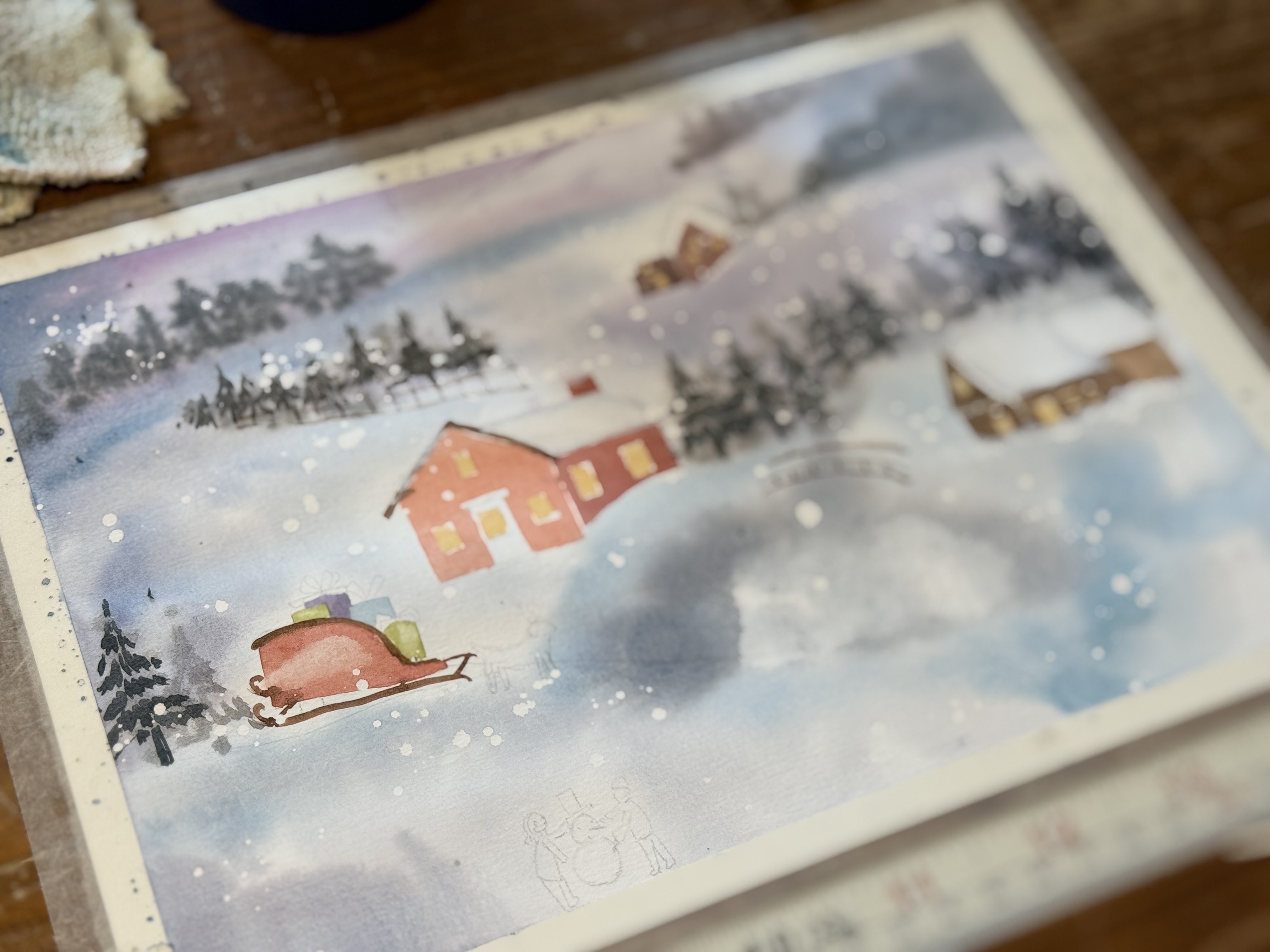 雪景的層次表現:學習如何用水彩暈染出遠近樹木與飄雪效果