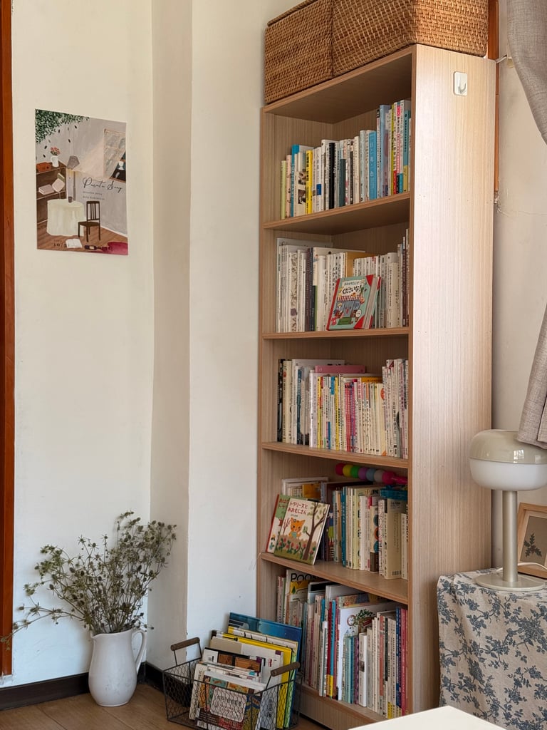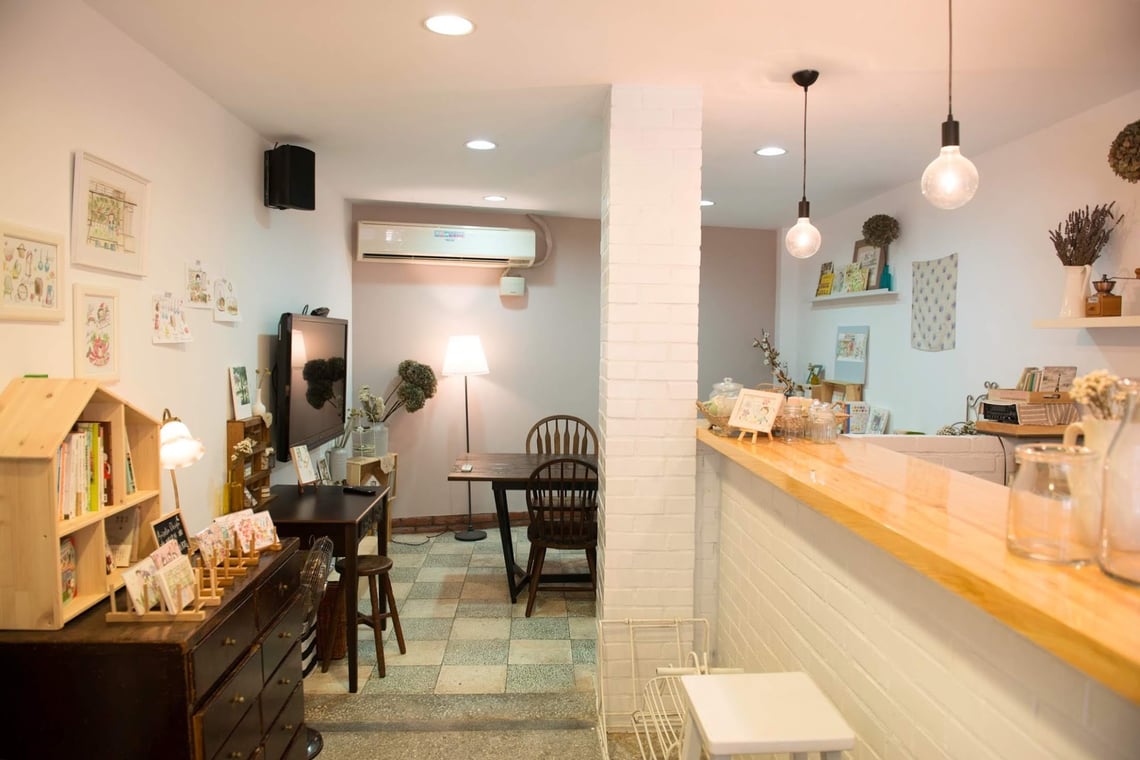 磚紅色的牆面、窗邊盛開的小花,以及櫥窗裡一冊冊靜靜排列的書本,構成了一種專屬於生活的溫柔風景。