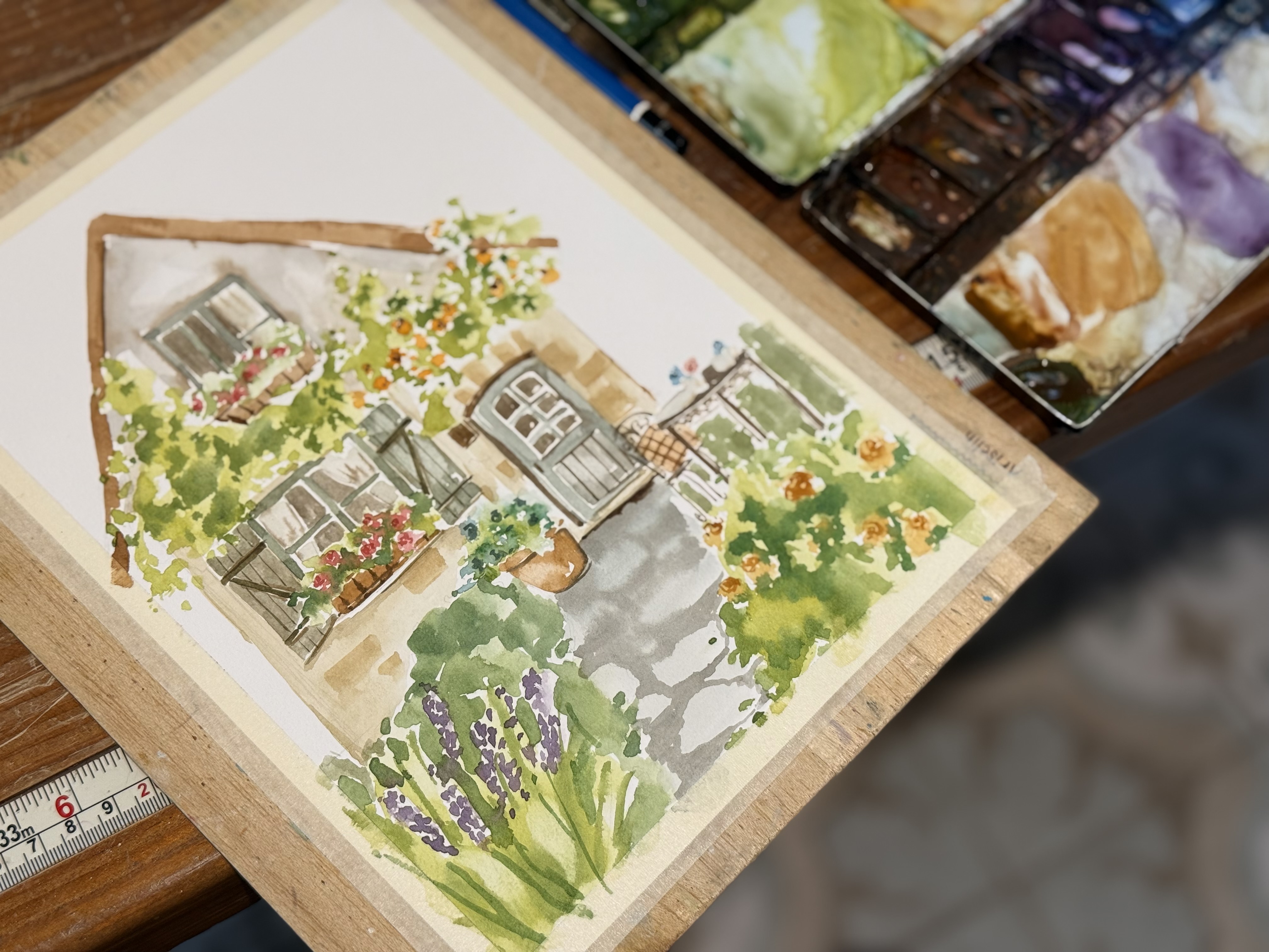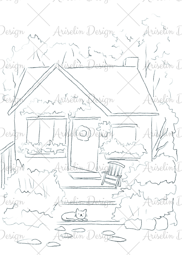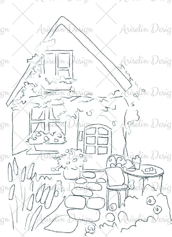 ✔ 主題式創作:以英式鄉村小屋為主體,練習畫出窗台花箱、藤蔓、木門、窗光等經典細節。