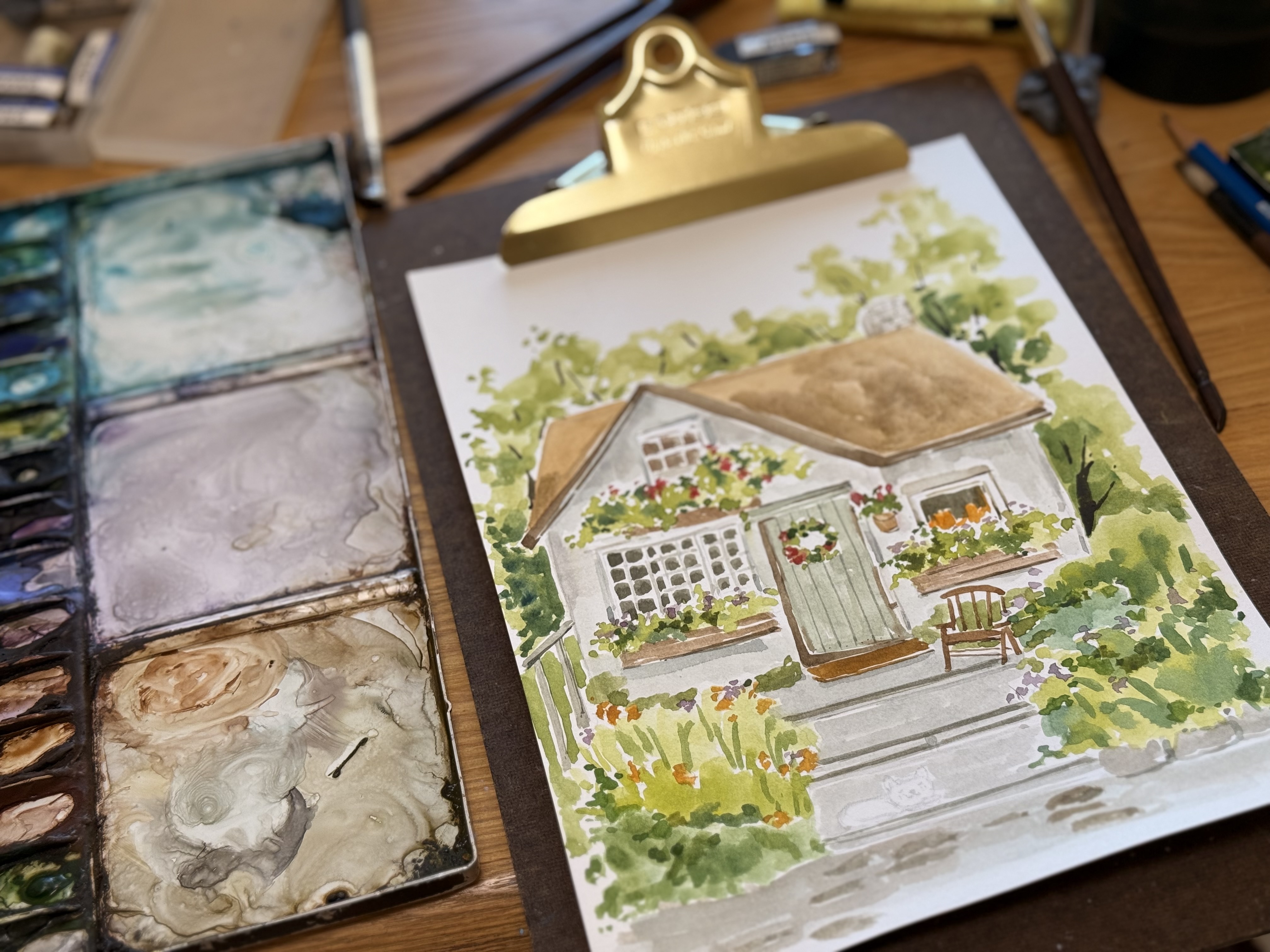 在水彩的世界裡,慢下腳步,走進一座被植物擁抱的小屋,感受陽光、微風與綠意交織的日常。