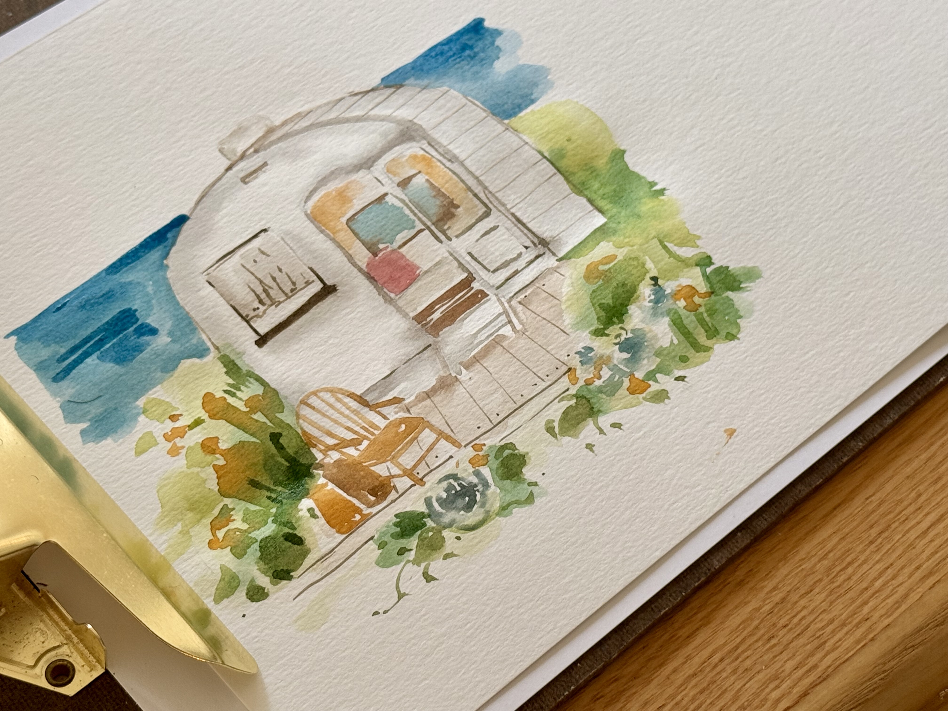 在水彩的世界裡,慢下腳步,走進一座被植物擁抱的小屋,感受陽光、微風與綠意交織的日常。
