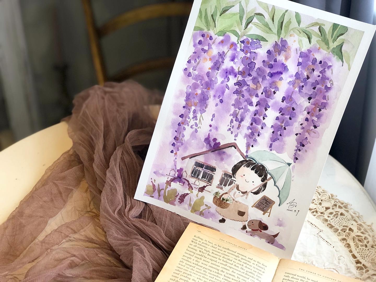 試著來畫一幅完整的作品吧!我們將春天的紫色收進調色盤內,用深深淺淺不同的紫來表現紫藤花