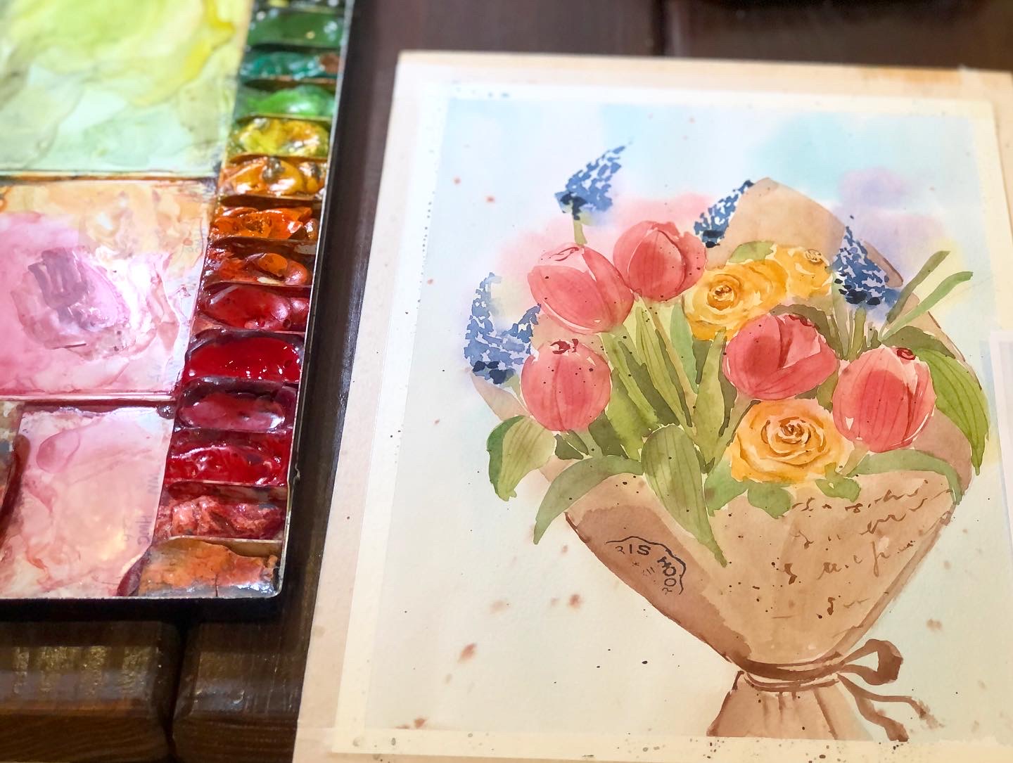 課程中將示範鬱金香、黃玫瑰、葡萄風信子的繪畫方法,與整幅鬱金香花束的繪製。此課程為將從中帶入水彩基本的渲染、平塗、留白等技法。同學學習後可以依教學的方式畫出其他療癒人心的花束作品。